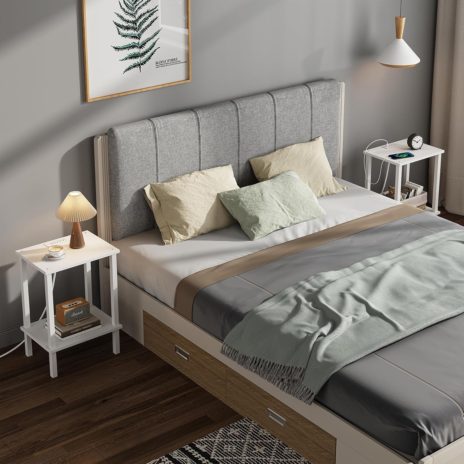 TUTOTAK End Table with Charging Station, Set of 2, Small Side Table with Outlets, Nightstand Bedside Table, 2-Tier Storage Shelf for Small Space, Living Room, Bedroom White TB01BW041