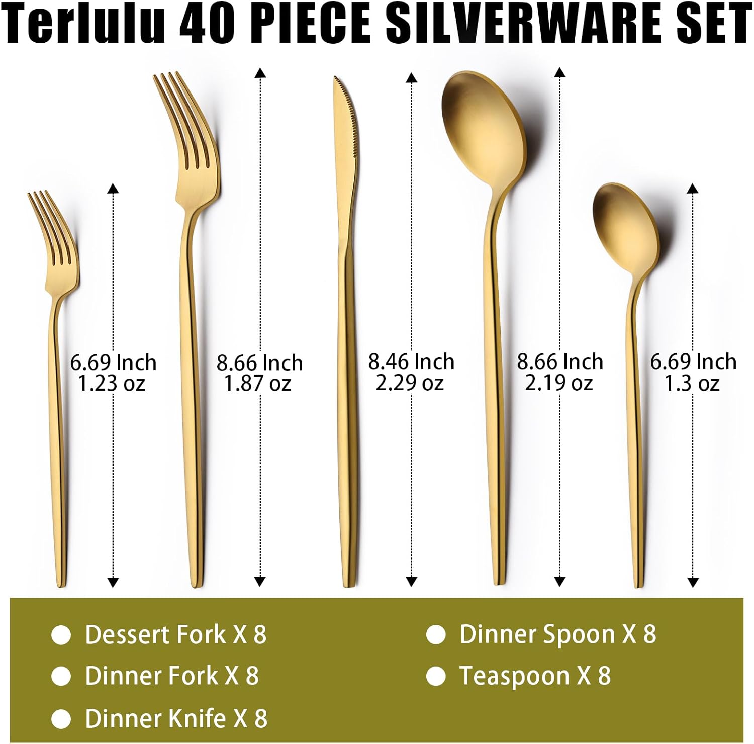 - ăSERVICE FOR 8ă Terlulu 40 piece gold silverware set for 8 includes 8 dinner forks, 8 dinner spoons, 8 dinner knives, 8 teaspoons, 8 salad/dessert forks in normal size, perfect for most families.