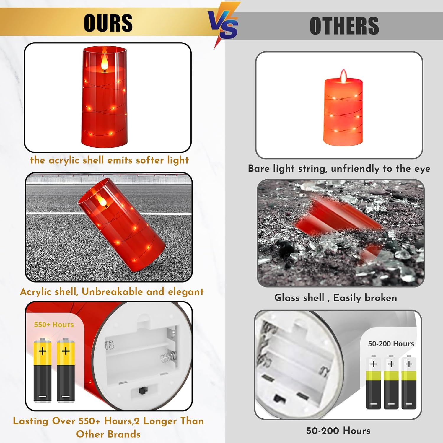 - 3D Wick and Realistic Appearance, Unbreakable Design - Made of premium acrylic, 3D black wick realistic flicker design. Compared with glass radiance candles, premium imitation glass acrylic shells make the battery candles stronger and long-lasting. Through the clear shell, feels and looks like real wax pillar candle flame