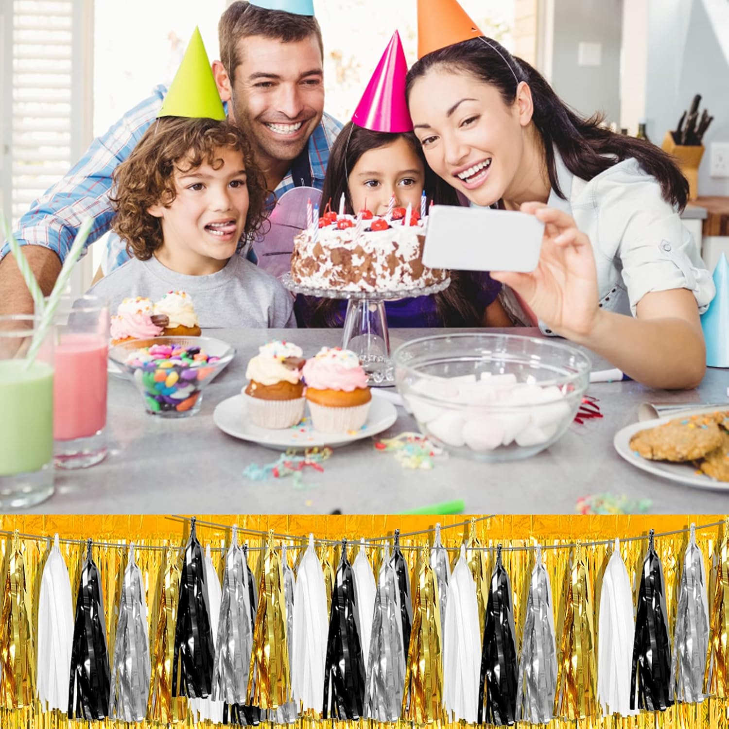4P Black Gold Silver Foil Fringe Metallic Tassel Garland, Tassels Banner Streamers for Parade Floats, Bachelorette, Wedding, Birthday, Halloween, Christmas, Bridal/Baby Shower Party Decorations