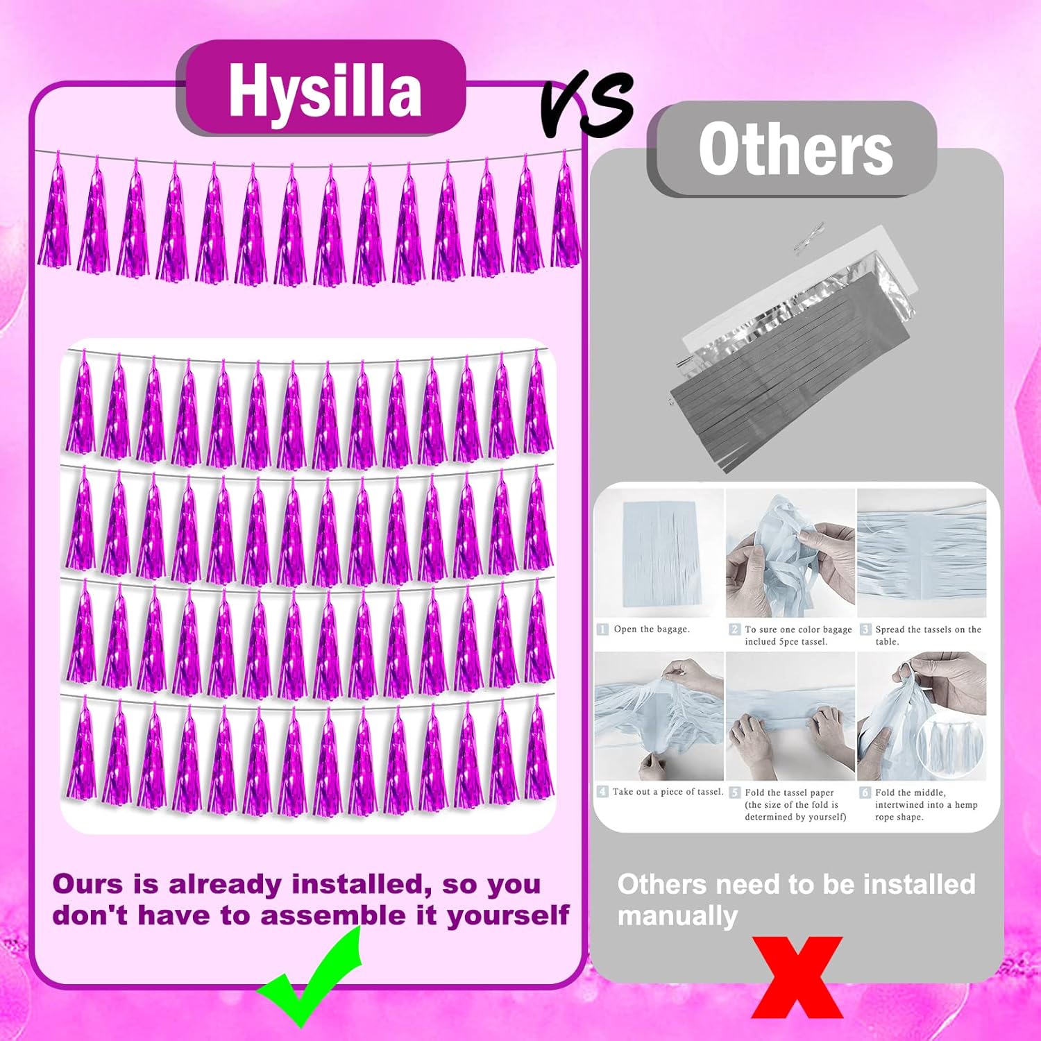 - 【Reusable Tassel Garland Material】: high-quality metallic foil tassel garlands, with the virtue of nice craftsmanship and lightweight, they are reusable and safe, and not easy to fade; They come with white ribbon for hanging, and garland tassels hang perpendicular to the string, and are adjustable to provide you with the option of spreading the tassels out or piecing them closer together.