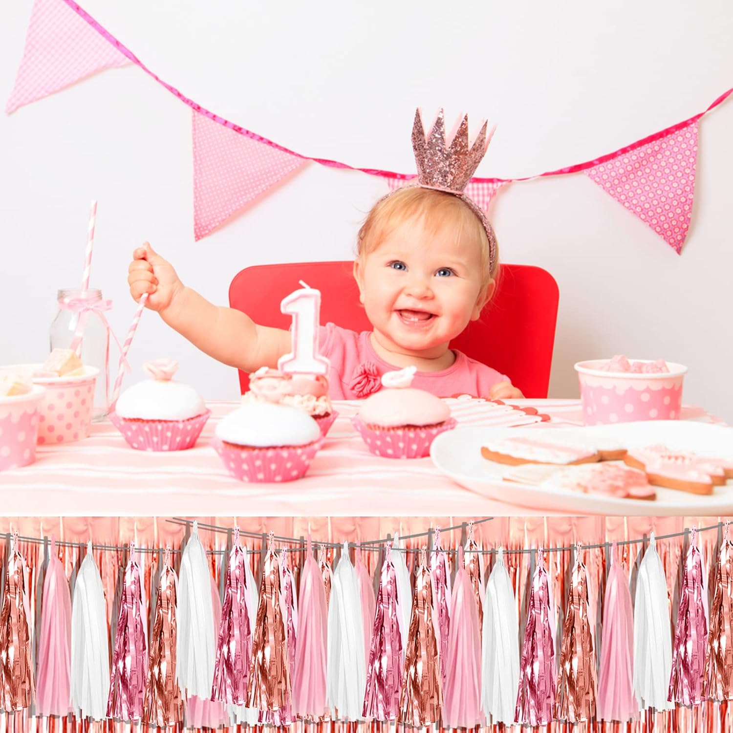 - 【Pink White Peach Rose Gold Party Supplies Set】: The total length of the pink white peach rose gold birthday tassels banner is 26.2 feet, divided into 4 strips, each 6.5 feet long. Each banner contains 15 tassels, and each tassel measures 14 inches, for birthday decorations many occasions, and so on