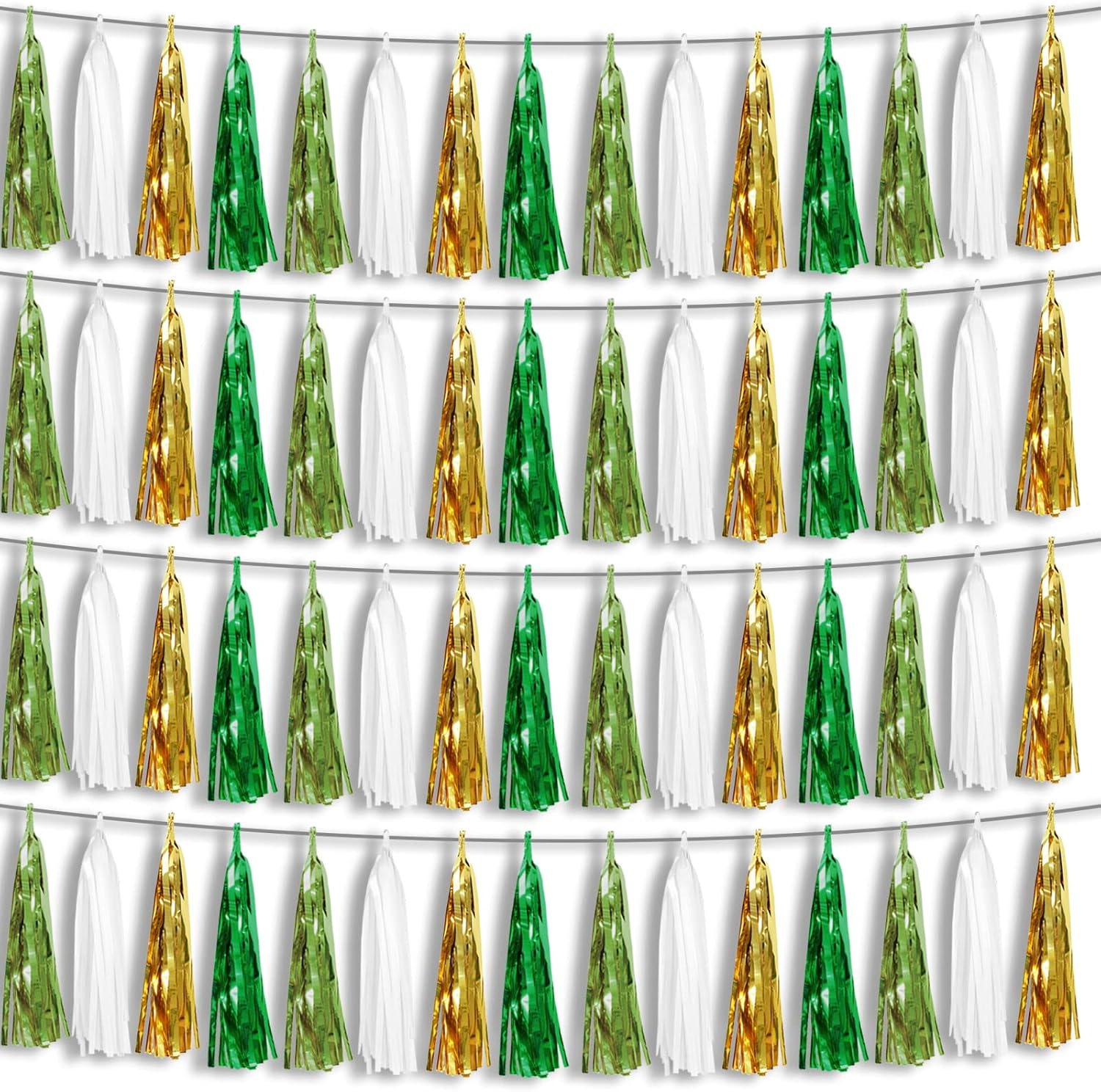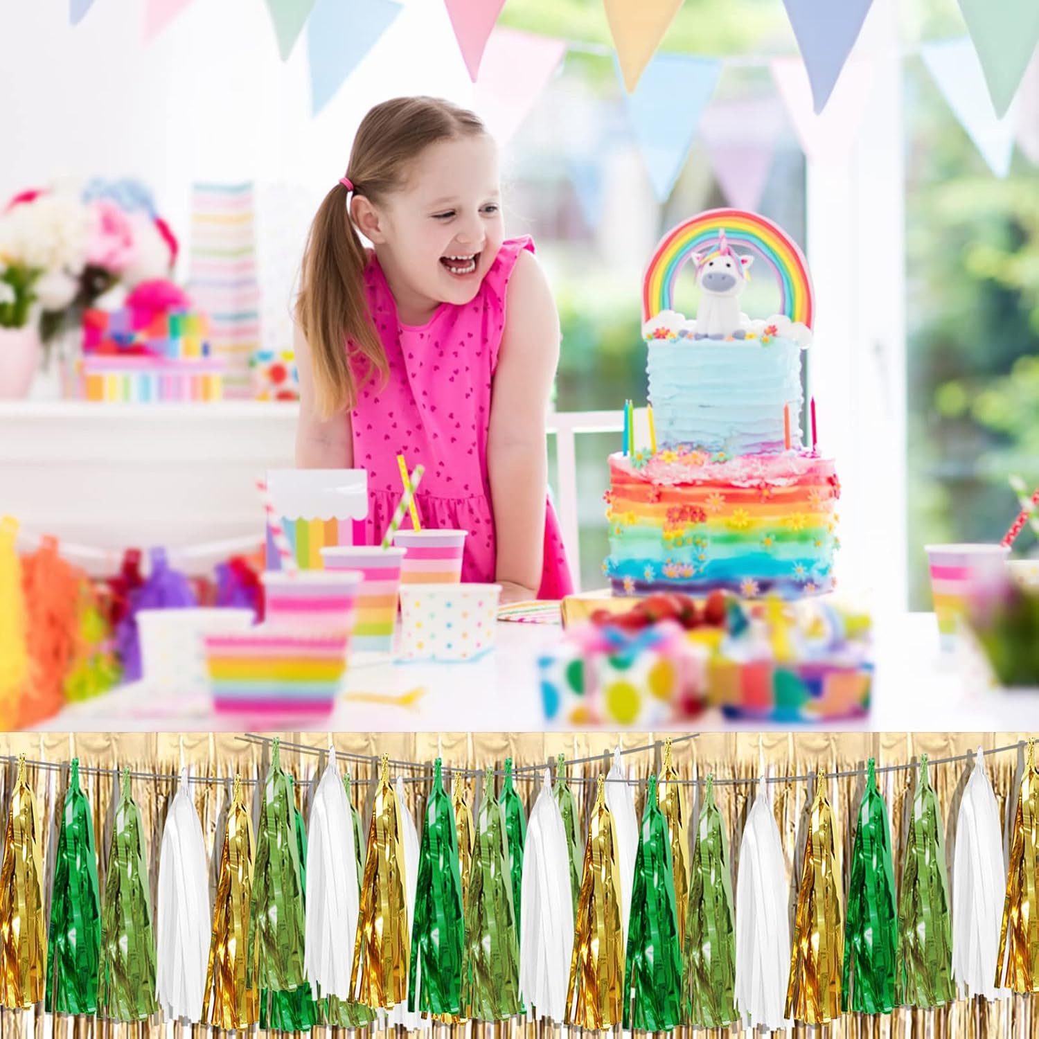 - 【Light Green White Gold Green Party Supplies Set】: The total length of the Light Green White Gold Green birthday tassels banner is 39.3 feet, divided into 4 strips, each 9.8 feet long. Each banner contains 15 tassels, and each tassel measures 14 inches, for birthday decorations many occasions, and so on