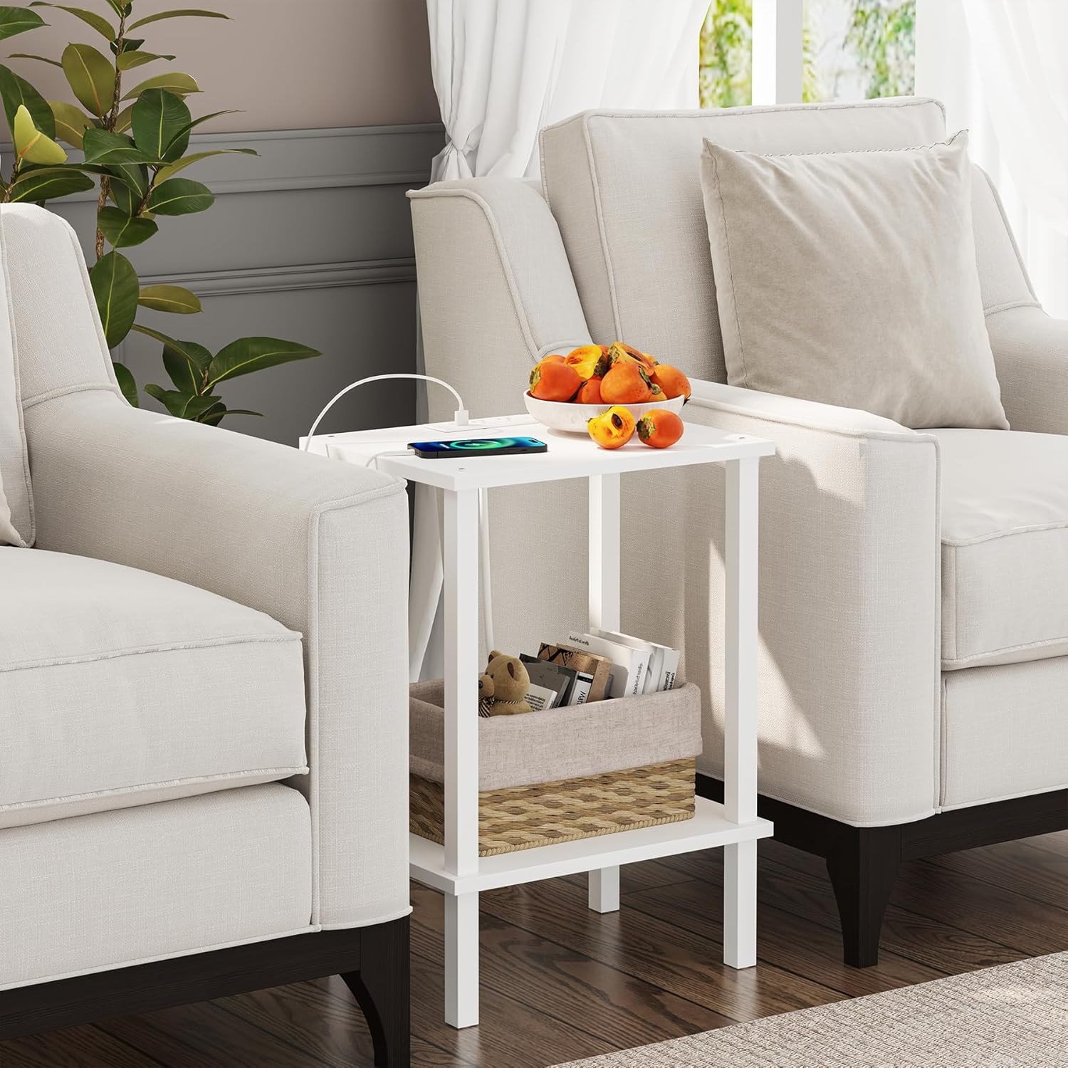 TUTOTAK End Table with Charging Station, Small Side Table with Outlets, Nightstand Bedside Table, 2-Tier Storage Shelf for Small Space, Living Room, Bedroom, White TB01BW040
