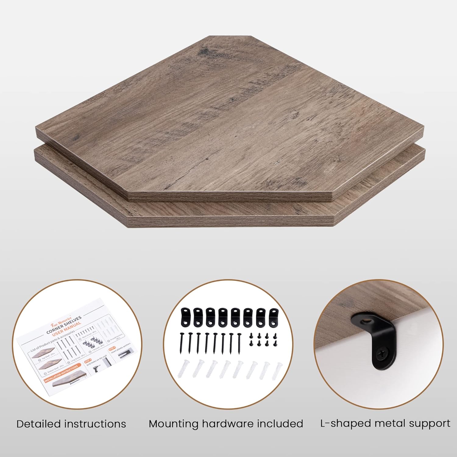 Corner Shelf Wall Mount, Floating Corner Shelves, Set of 2 Corner Wall Shelf Organizer, Rustic Wood Wall Storage Display Shelves for Living Room Bedroom Bathroom Kitchen, Rustic Grey