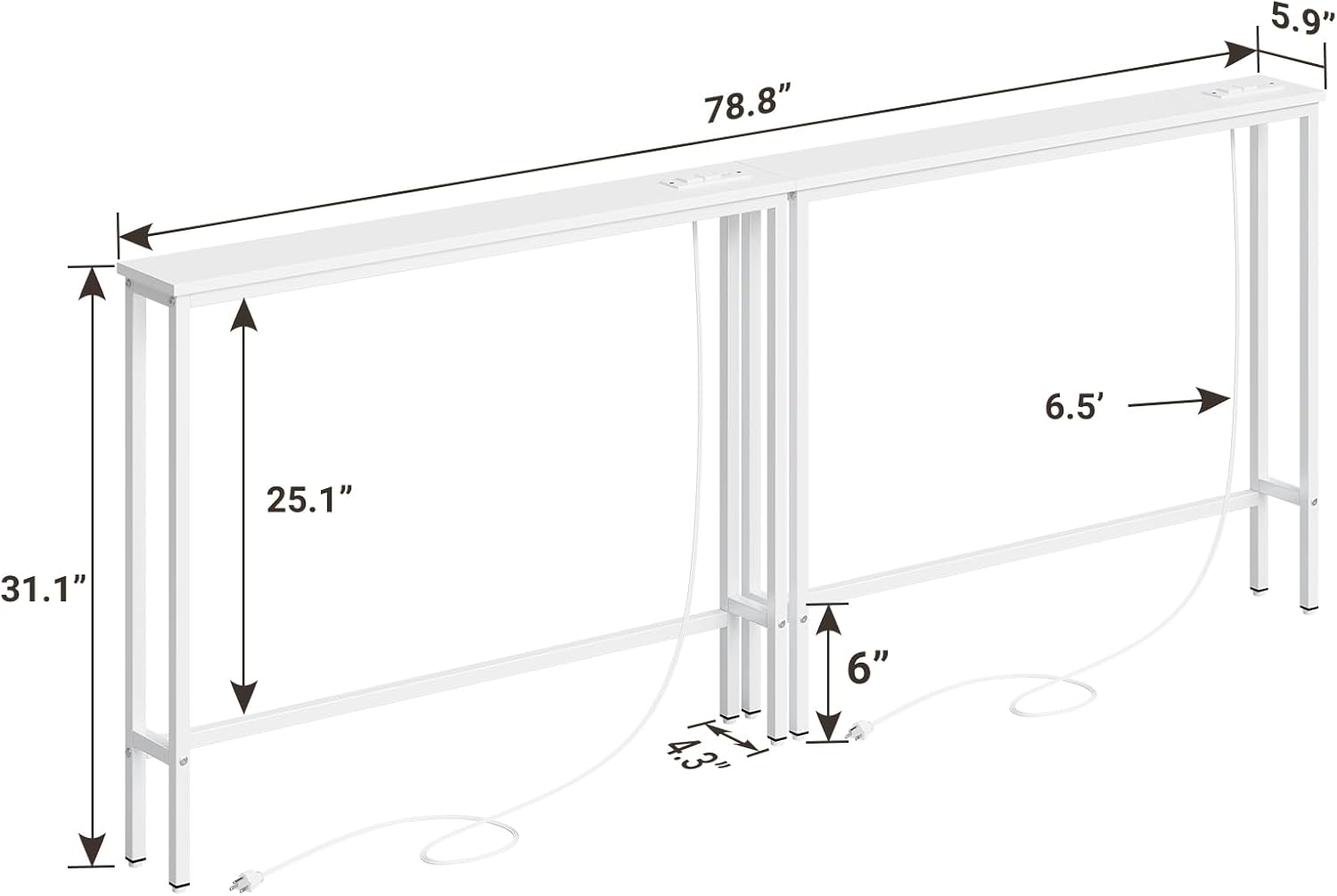 ELYKEN 2 Pack 5.9" Narrow Console Sofa Table with Power Outlets, 5.9" Dx39.4 Wx31.1 H Long Couch Table with Metal Frame and Charge Station with 6.5’ Extension Cord, White