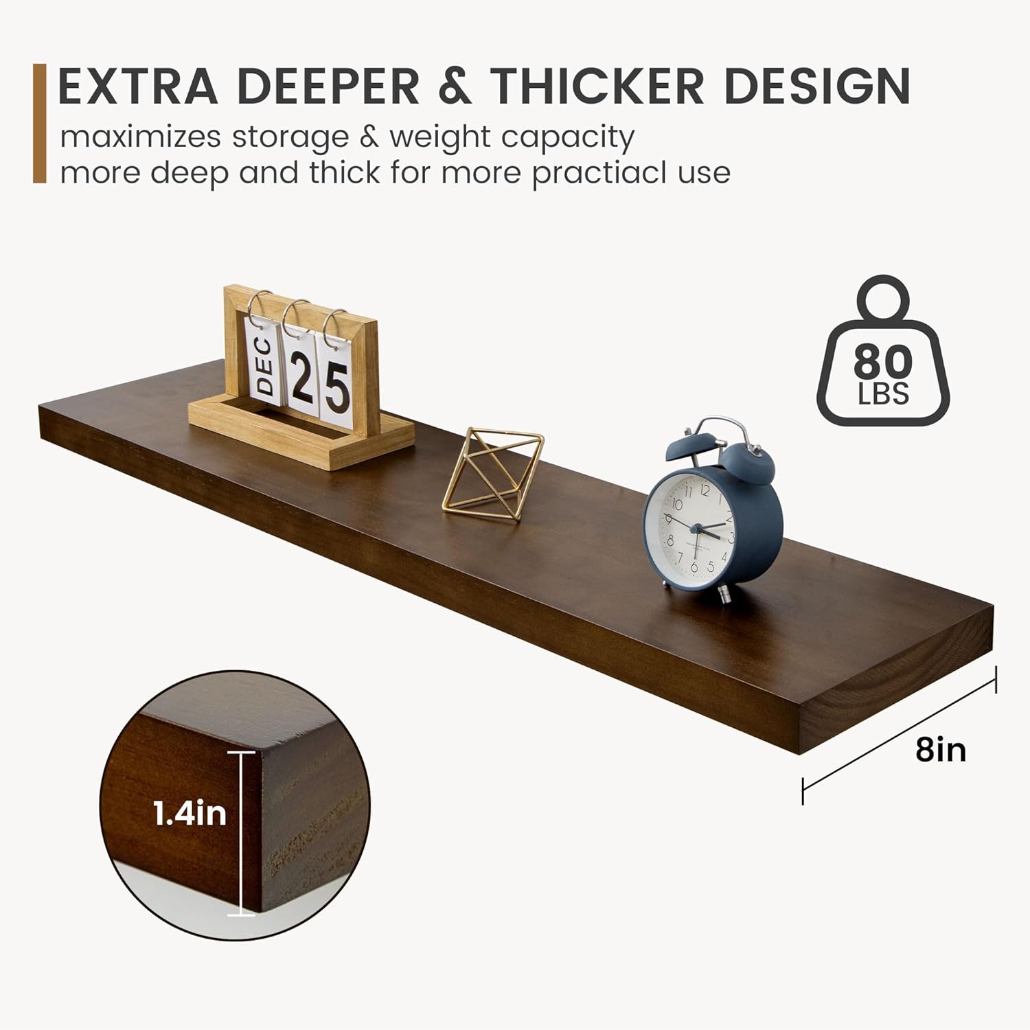 - Extra Deeper & Thicker for Storage - Each board measures 36"W x 8"D x 1.4"H. Extra deeper and thicker design in order to bring maximizes storage space and weight capacity, even hold up to 60 lb. This floating shelf taking up zero square feet, reduces clutter and highlights dรฉcor in compact spaces. It can help make full use of the empty wall, making it much more space-saving and making your room look larger and tidier.