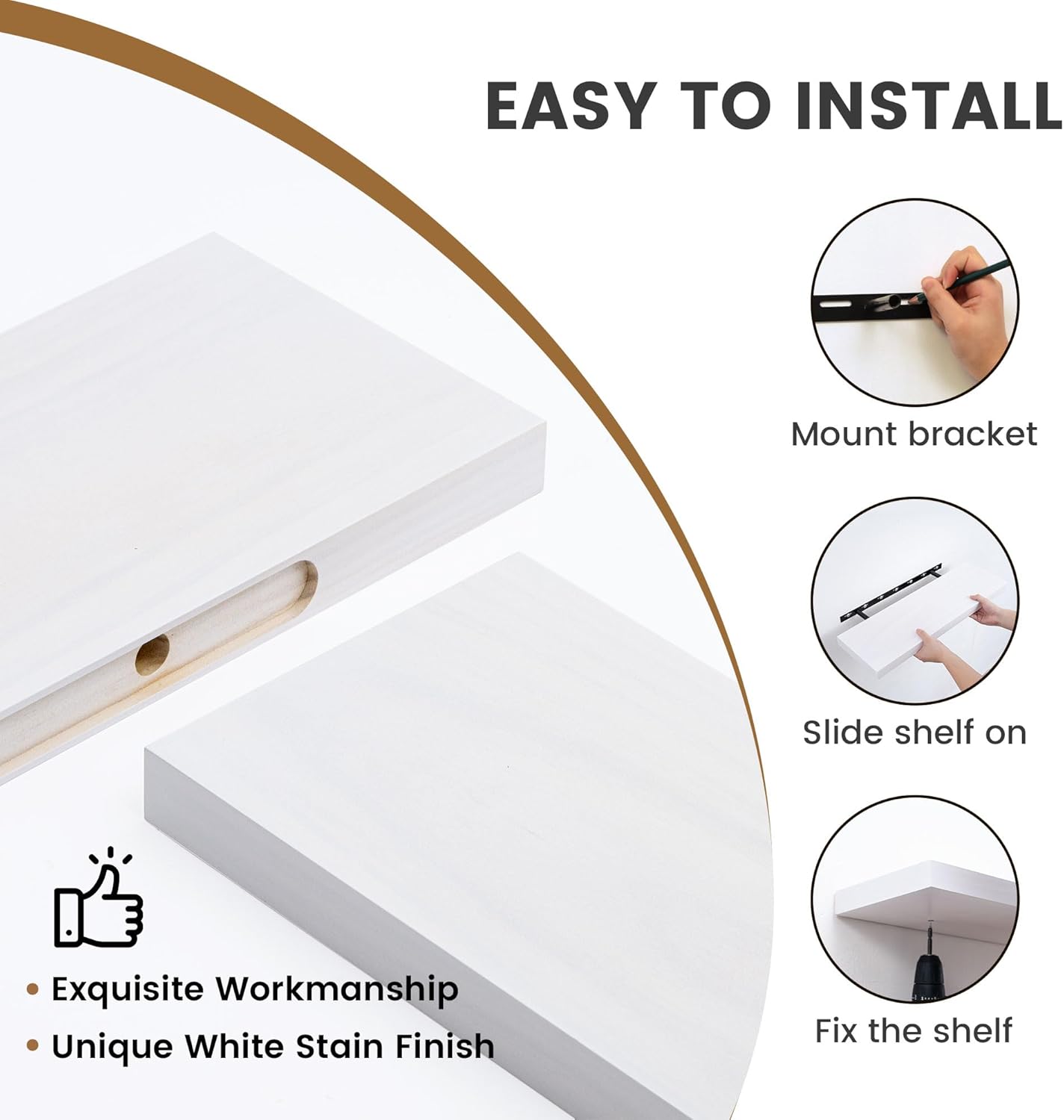 - Heavy-Duty Mounting Support - Our flush mount design ensures a seamless and visually pleasing installation, with the shelf appearing completely vertical to the wall. The bracket remains invisible, adding to the aesthetic appeal of your decor. To prevent any sagging, our shelves feature slightly upturned rods that provide reliable support for the board. Our thoughtful design ensures that your shelves remain securely in place, providing peace of mind while highlighting your beloved items.