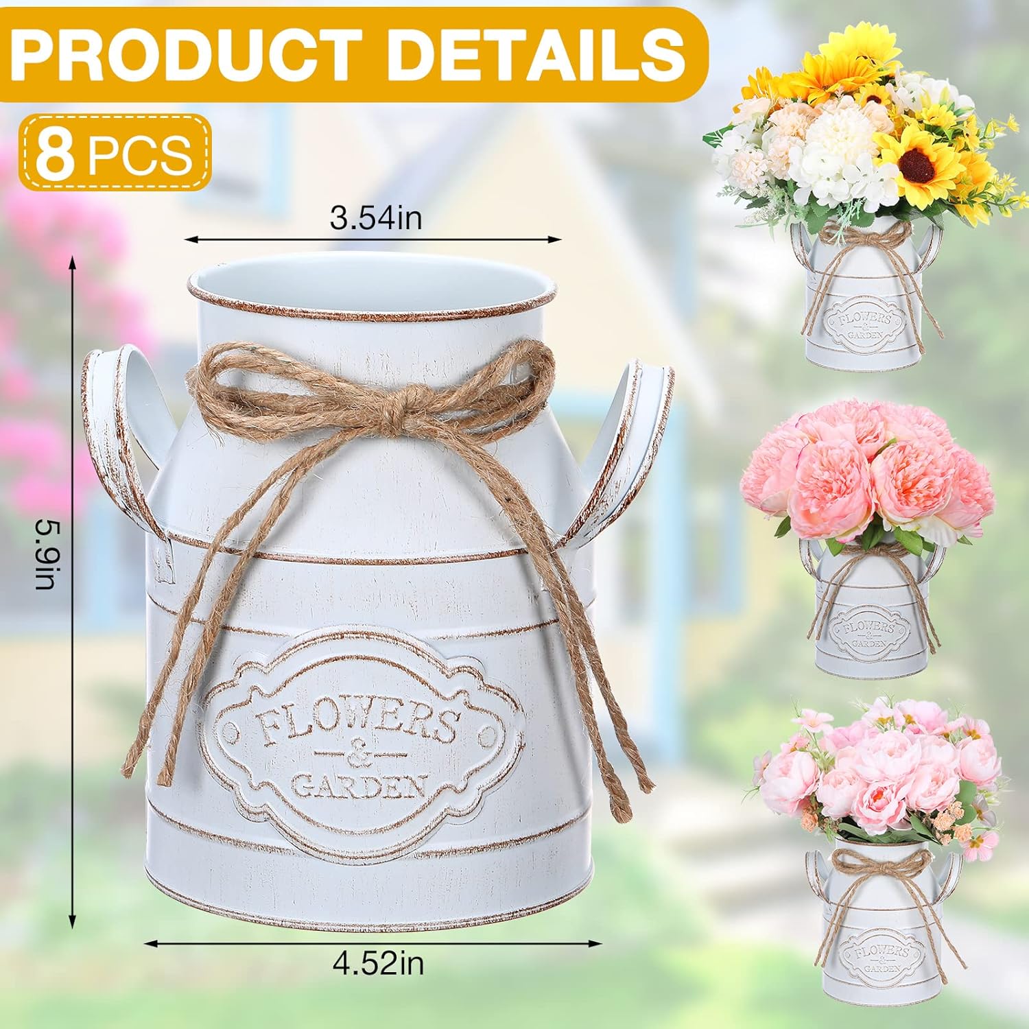 6 Inch Farmhouse Vase Decor Milk Can Vintage Flower Jug Galvanized Metal Vase with Handle Rustic Flower Buckets for Thanksgiving Christmas Table Centerpiece Weddings Gifts(Retro White,8 Pcs)