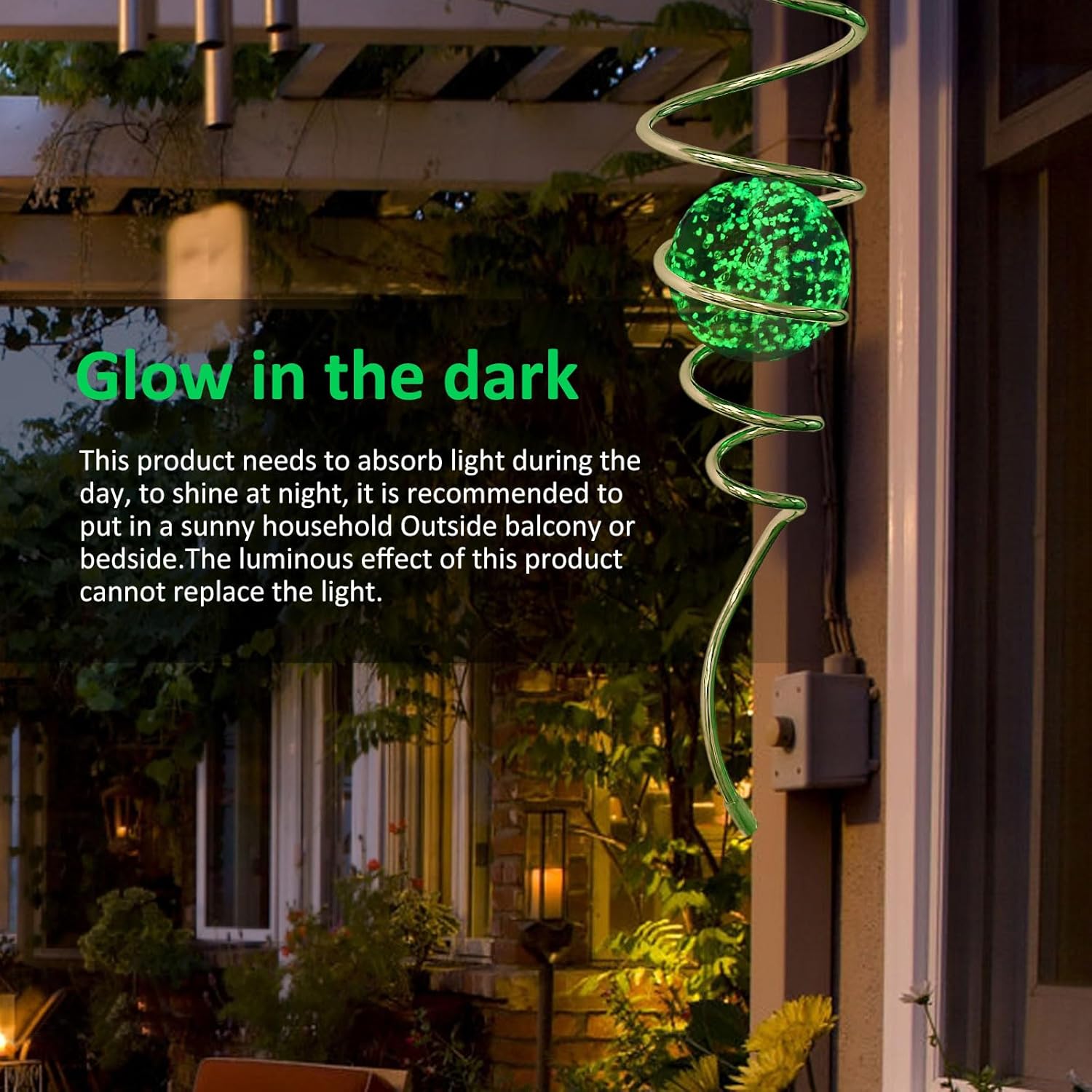 - 【Unique Visual Illusion Spiral Design】The gazing ball spiral tail is an unique hanging ornament ,Also it can help to stabilize 3D wind spinners or yard decor from swing when it rotate.When the spiral tail rotates to the left, the glass ball seems to move upwards,when the spiral tail rotates to the right, the glass ball seems to moves downward,the glass ball seems to like floating and dancing in air, presenting a magical optical illusion!It doesn't shine in the daytime,It needs to glow in the dark.