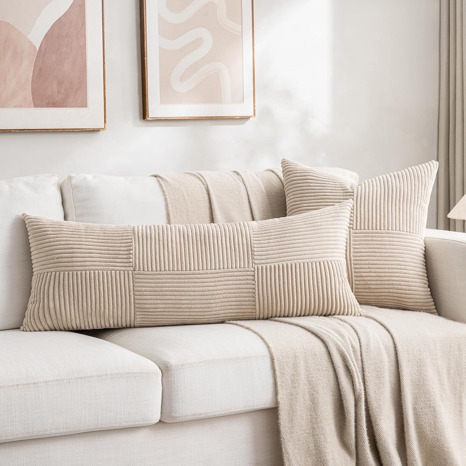 Fancy Homi 2 Packs Tan Decorative Throw Pillow Covers 18x18 Inch for Living Room Couch Bed, Rustic Farmhouse Boho Home Decor, Soft Corss Corduroy Patchwork Textured Square Beige Cushion Case 45x45 cm