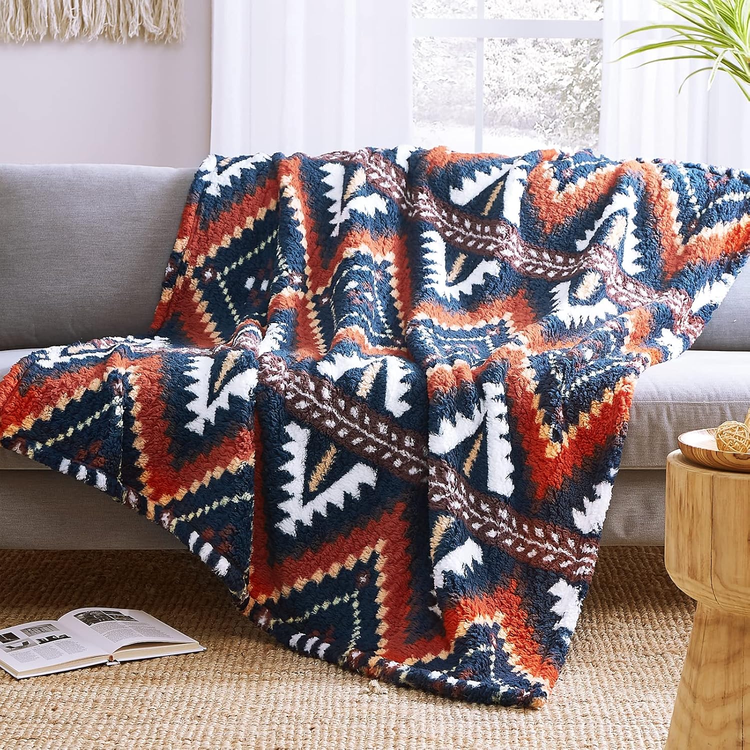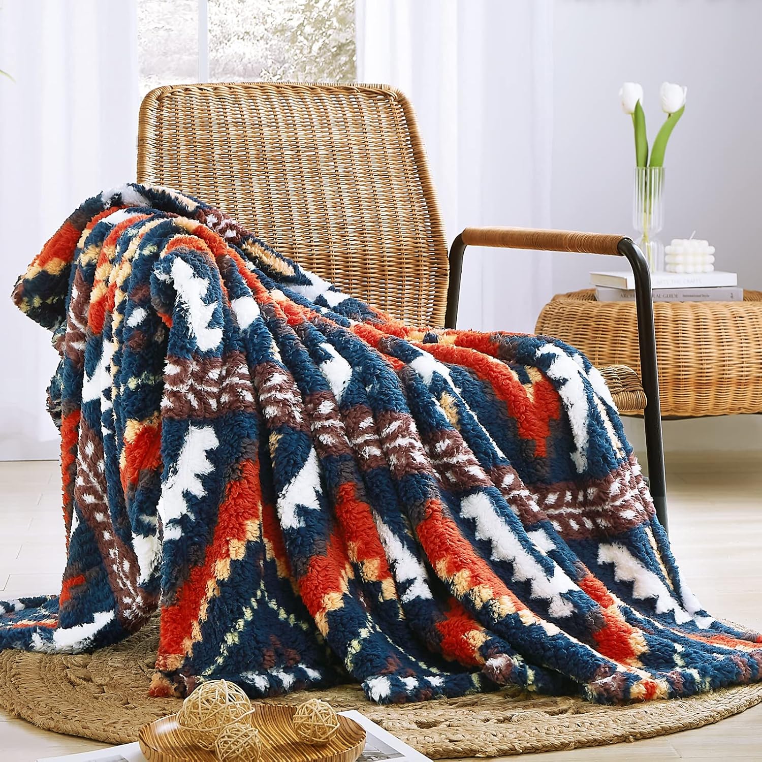 CASAAGUSTO Boho Sherpa Blanket, Aztec Twin Blanket, Ultra Soft, Warm, Cozy, Plush, Thick Fleece Western Blanket for Couch, Bed, Sofa (Navy Blue 60 * 80 Inch)