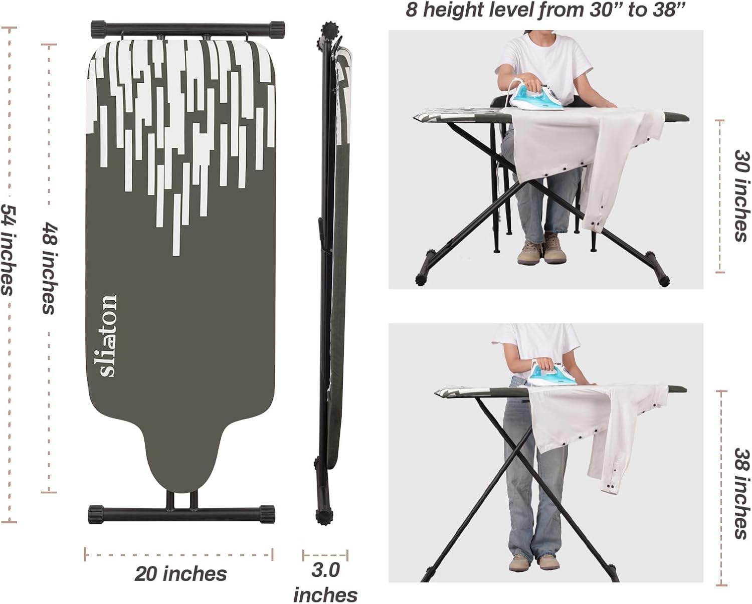 - Adjustable Height - This ironing board offers multiple height adjustments ranging from 30" to 36". Whether you prefer standing or sitting while ironing, or sharing it with someone of different heights, It's the ideal choice for both men and women.