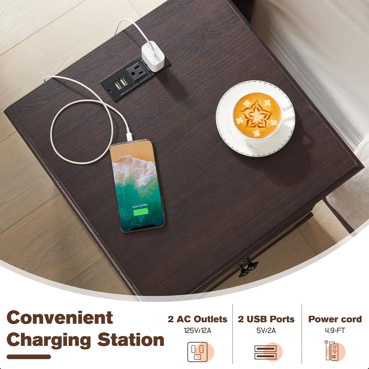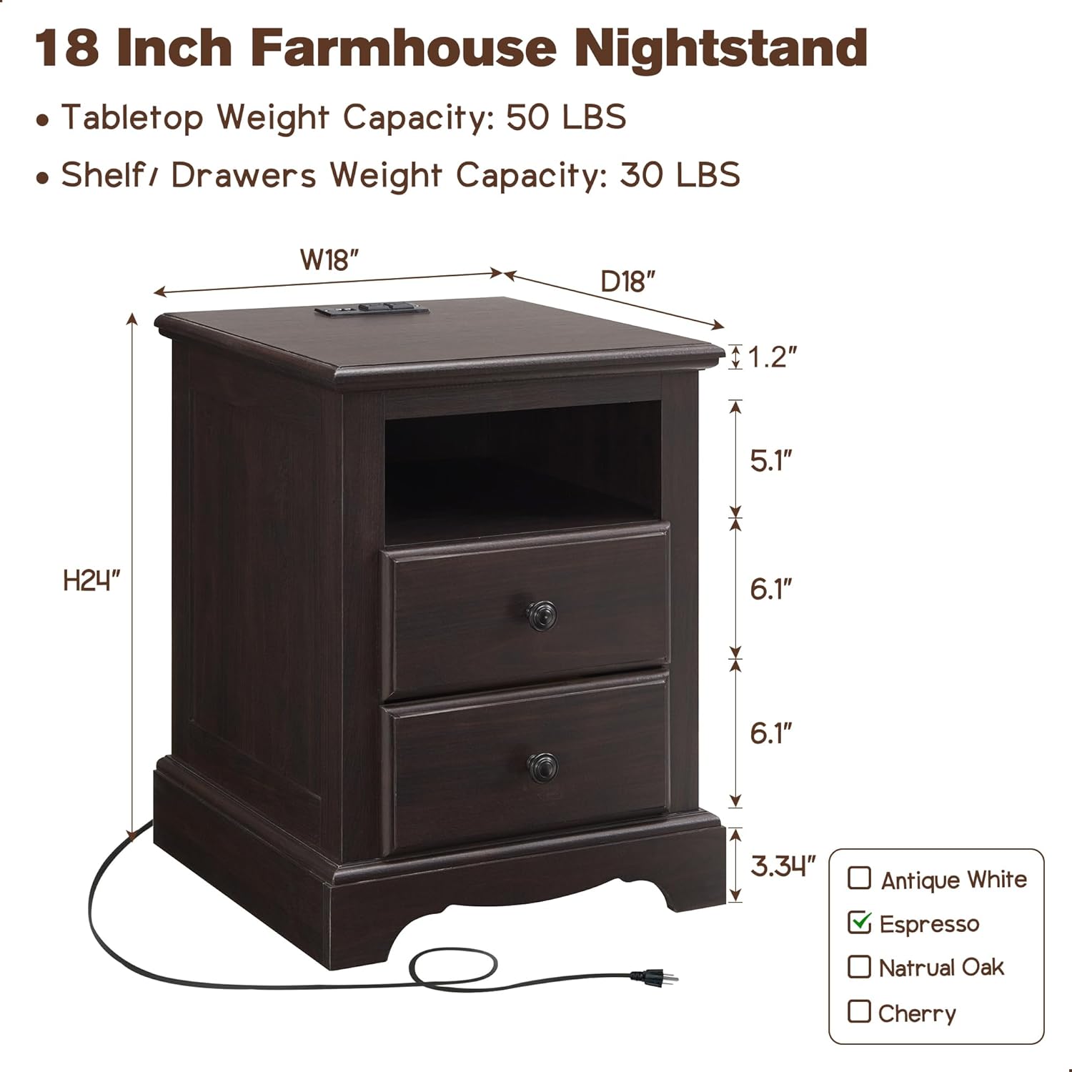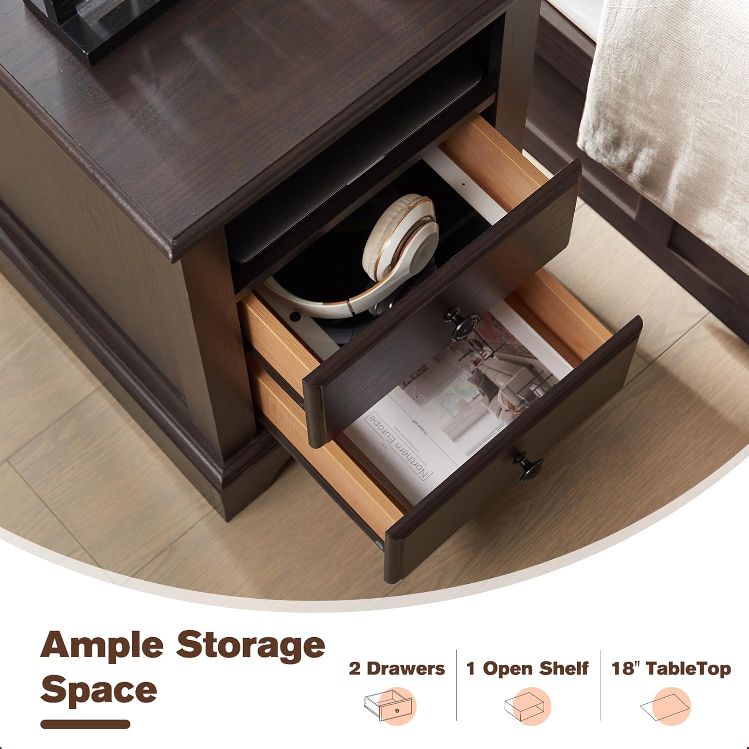 T4TREAM Nightstand with Charging Station, 18 Inch Vintage End Table with 2 Drawers for Living Room, Wood Rustic Sofa Side Table with Open Storage Shelf for Bedroom, Espresso