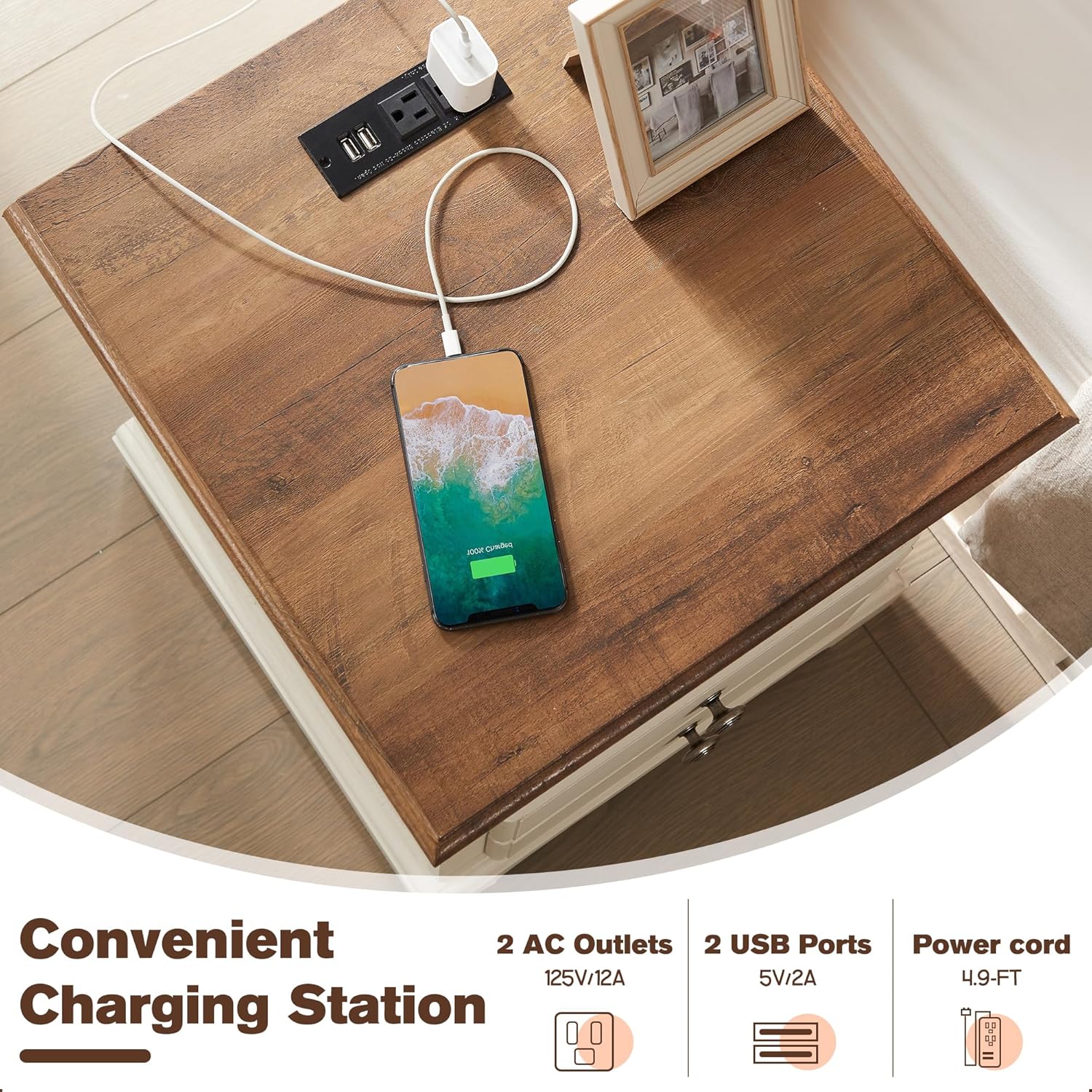T4TREAM Nightstand with Charging Station, 18 Inch Vintage End Table with 2 Drawers, Wood Rustic Sofa Side Table with Open Storage Shelf for Bedroom, Living Room, Antique White