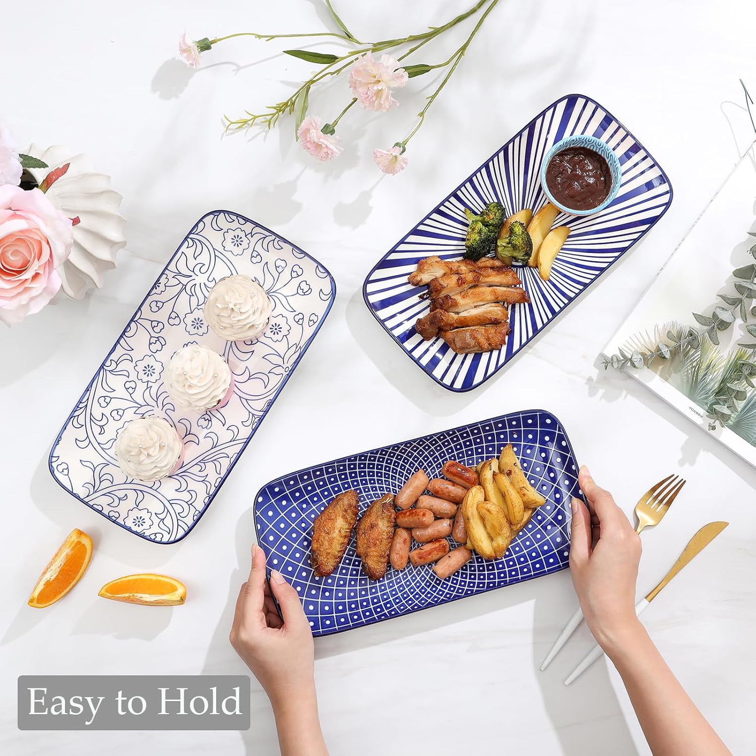 Selamica Ceramic Rectangular Serving Platters Set of 4, 12 Inch Serving Trays/Dishes for Party Entertaining, Rectangular Dinner Plates for Appetizer Salad Dessert Sushi, Vintage Blue