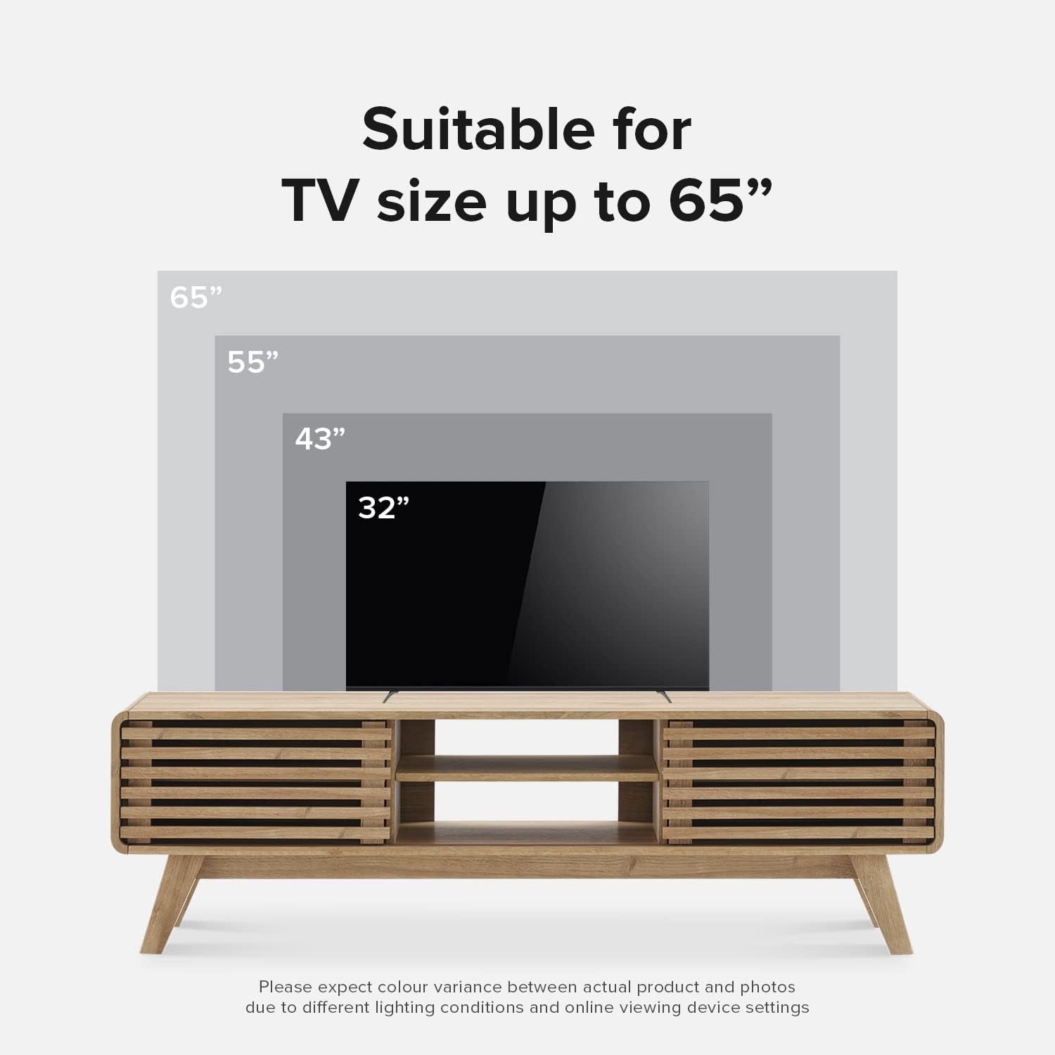 - Design: Mid-century modern TV stand with slatted door design and adjustable shelves. Multiple storage spaces for your consoles