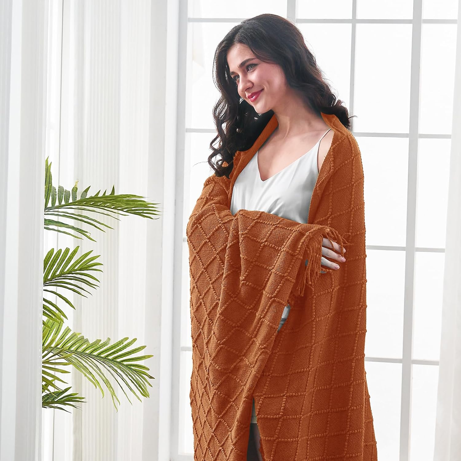 inhand Knitted Throw Blankets for Couch and Bed, Soft Cozy Knit Blanket with Tassel, Orange Rust Lightweight Decorative Blankets and Throws, Farmhouse Warm Woven Blanket for Men and Women, 50"x60"