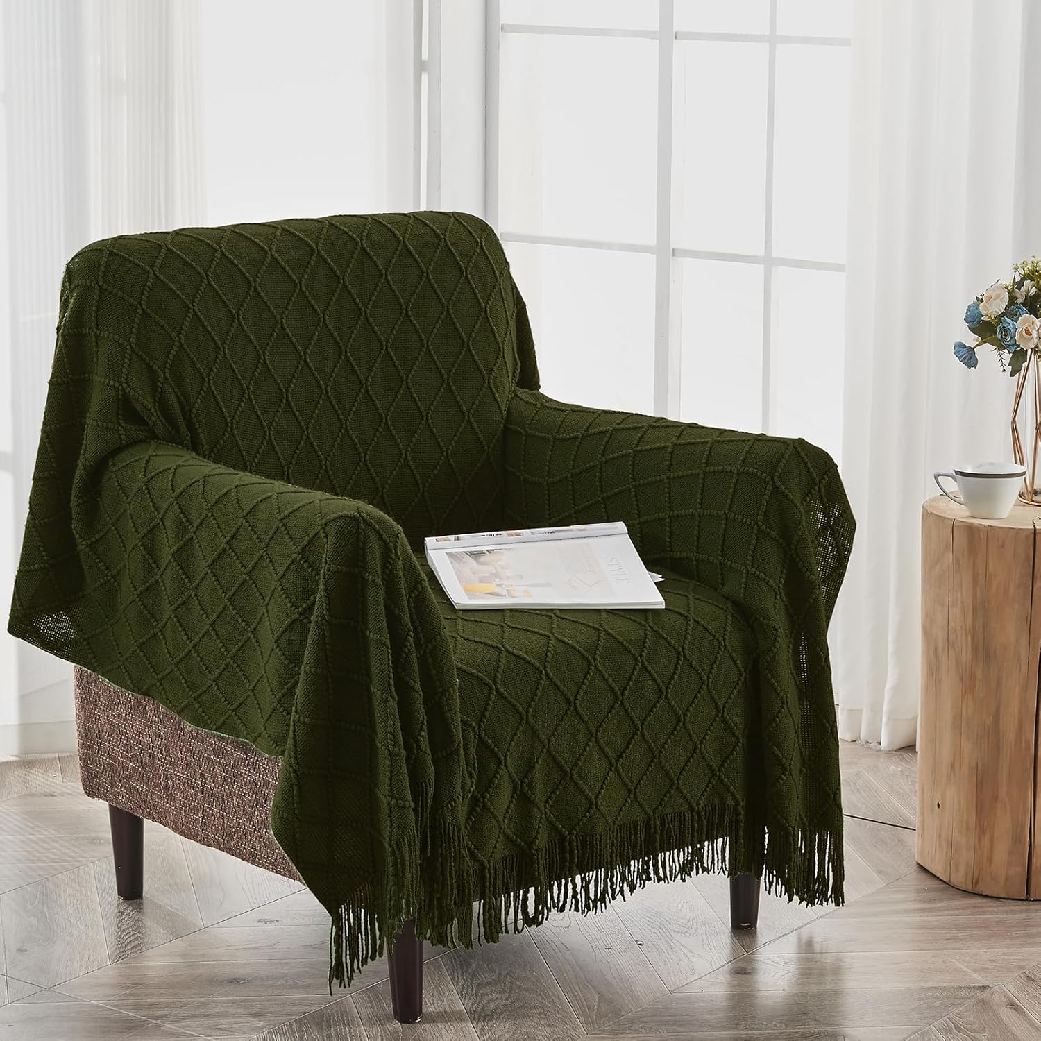 inhand Knitted Throw Blankets for Couch and Bed, Soft Cozy Knit Blanket with Tassel, Dark Green Lightweight Decorative Blankets and Throws, Farmhouse Warm Woven Blanket for Men and Women, 60"x80"