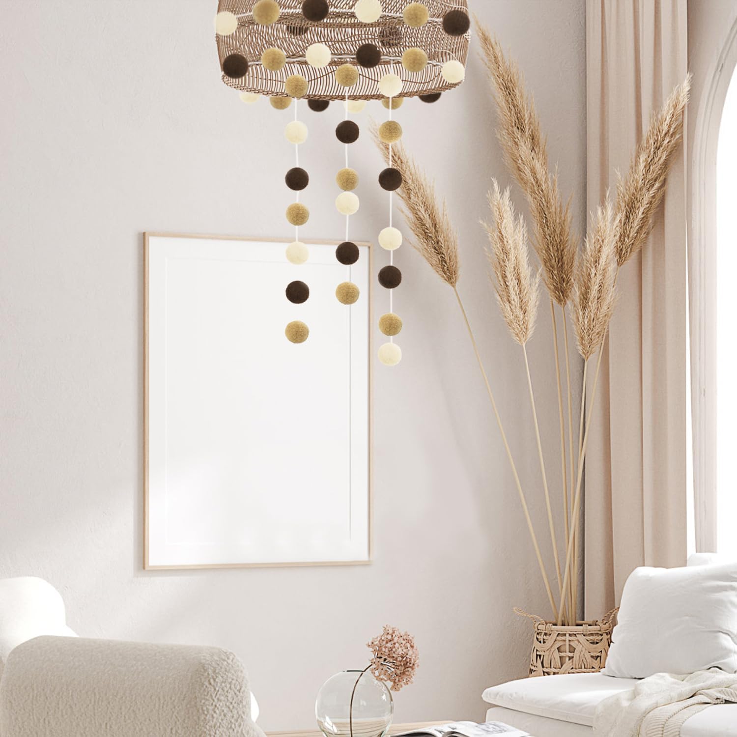 - POLYSTYRENE PREMIUM QUALITY: Our felt pom pom balls are made of high-quality polystyrene fiber and string together with white neutral chunky cotton yarn cord rope, polystyrene is an eco-friendly material, the mini felted balls has bohemian Boho Brown Khaki and Beige multi-color, solid and beautiful, fluffy and lightweight, bright and colorful, soft and comfortable, durable and reusable, so our sweet polystyrene felted pompom balls are more better than wool felt balls.