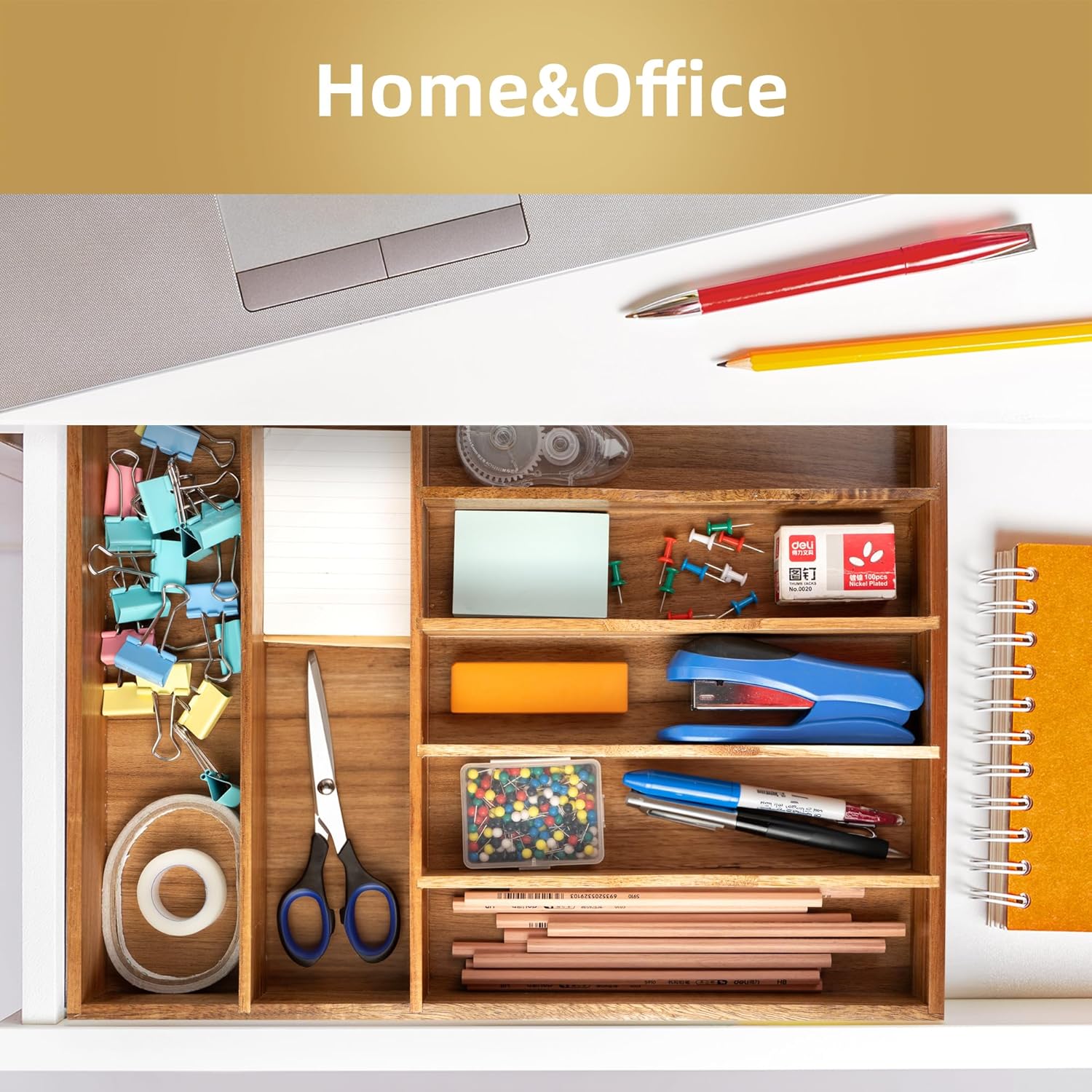 - ăKeep Your Home TidyăThis beautiful 7-compartments cutlery organizer has 2" deep compartments and can be placed into any drawer or desktop, which helps you to see everything at a glance and keep away from messy. The perfect space-saving acacia wood silverware organizer helps you to reach the desired item that you are looking for. Whether you are looking for your favorite knife or spoon, this utensil organizer makes it completely simple. We highly recommend to measure your drawer before order.