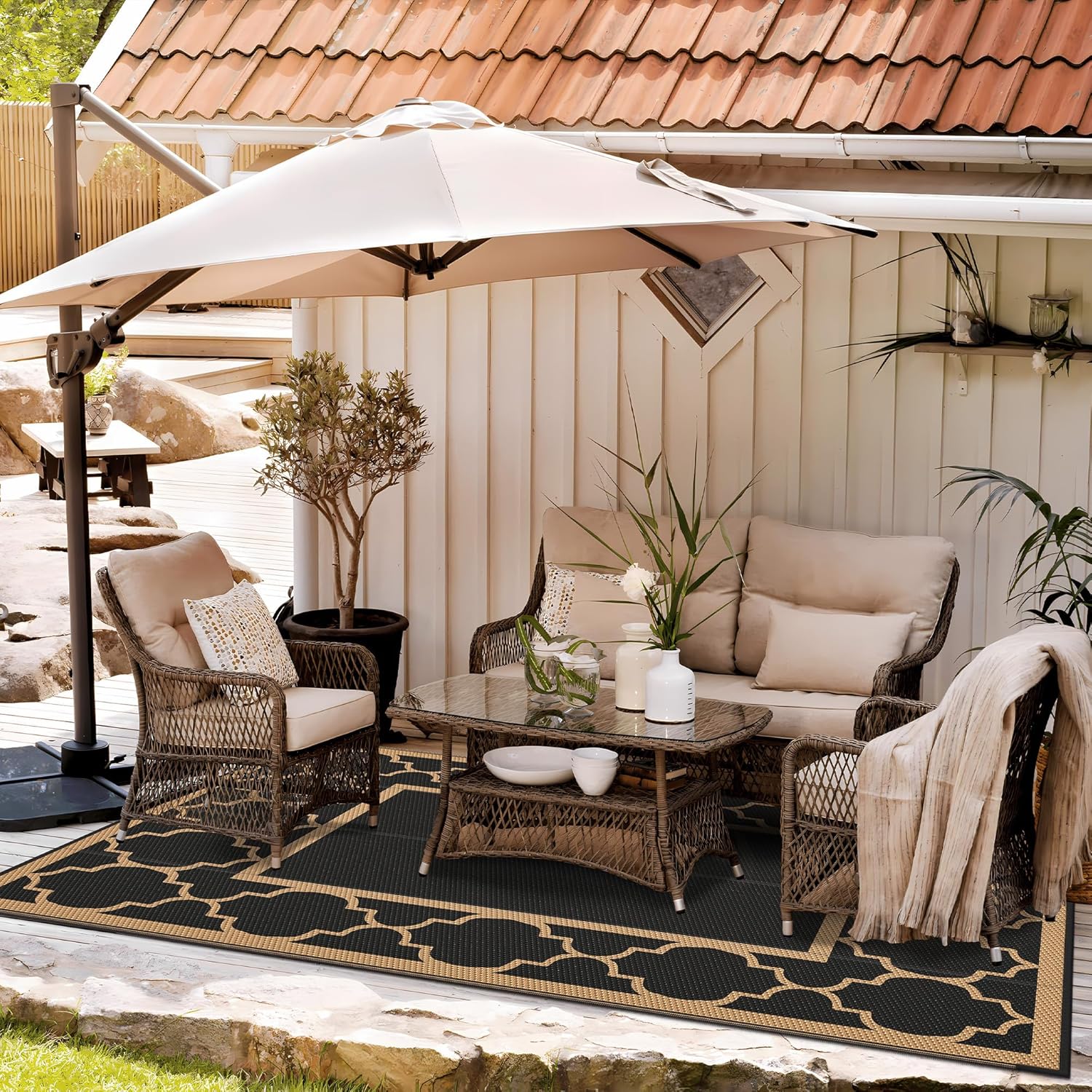 GENIMO 6' x 9' Outdoor Rug Waterproof for Patio Decor, Foldable Reversible Plastic Straw Area Rugs Mat for Camper, Outside Carpet for Rv, Deck, Porch, Picnic, Beach, Balcony, Black & Brown