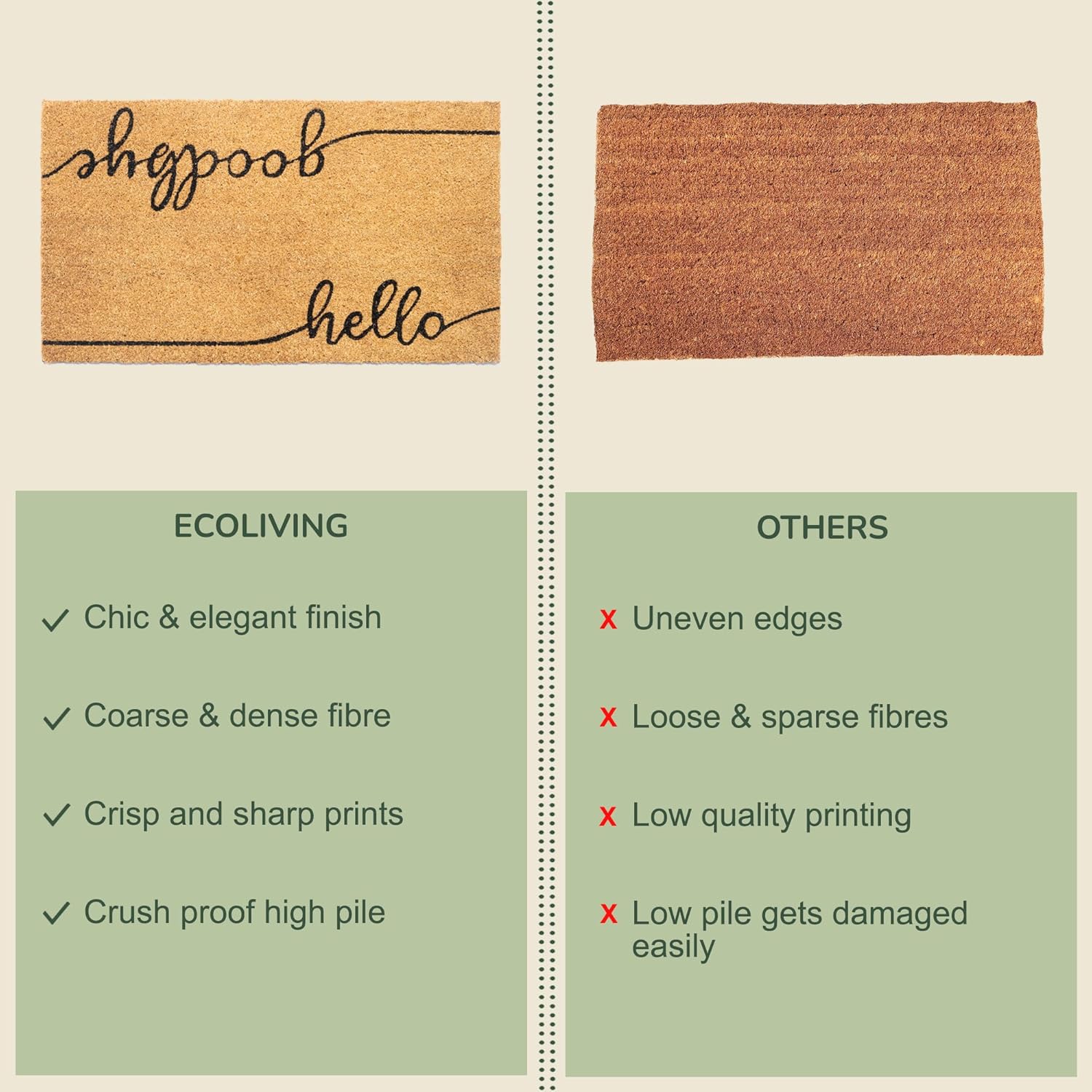 - NATURAL COIR MATS TO ENHANCE YOUR ENTRYWAY: Transform your entryway with our natural coir mats, designed to enhance the aesthetic appeal of your home. Crafted from high-quality coconut coir material, our outdoor rugs welcome door mat collection adds a touch of rustic charm to your patio decor, while ensuring functionality and durability.