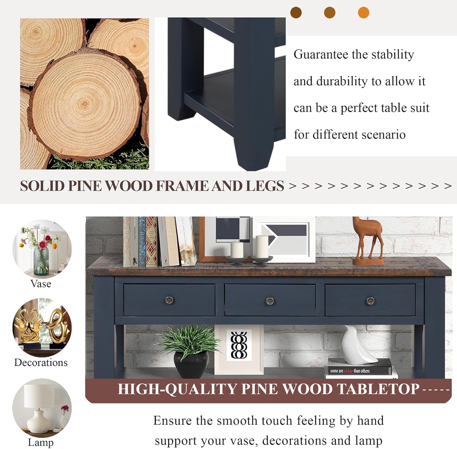 - 【Solid Wood Console Table】Our sofa table made of high quality wood material, the legs are thickened to enhance durability and stability, and the top is coated with environmentally friendly paint for wear resistance and durability, ensuring you can enjoy it for years to come.