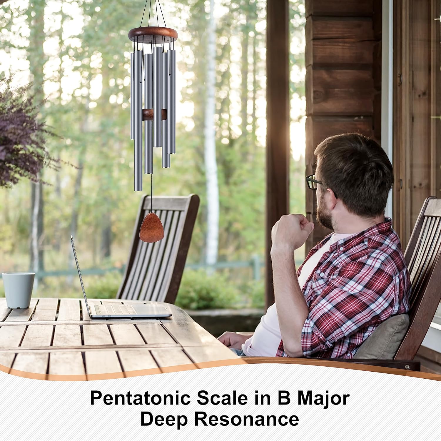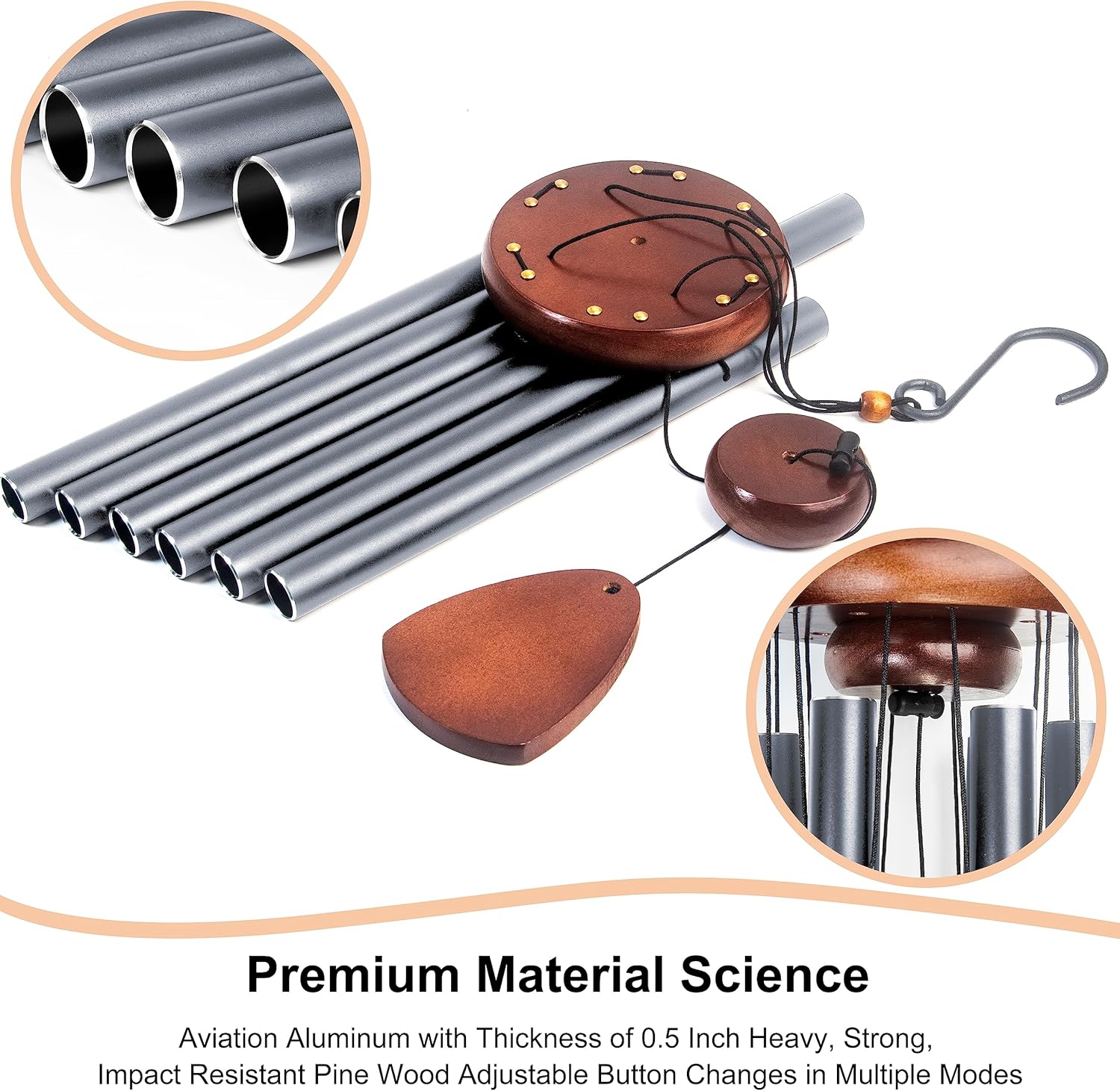 - π΅[Large Wind Chimes Size]: The windchime is made of premium aluminum pipe and pine. The total length of the wind chimes from the top's S-shaped hook to the bottom's catcher is 37" Among them, 6 classic blue gray anodized aluminum tubes have excellent corrosion resistance and wear resistance, and the length ranges from 8.7" to 12.6". The wood is made of wear-resistant and non-cracking pine.