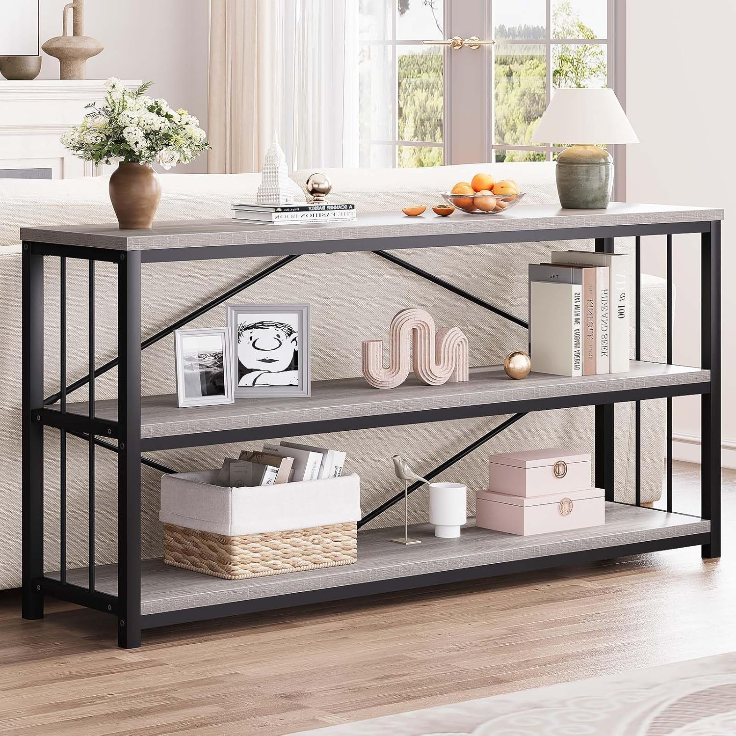 LVB Extra Long 3-Tier Sofa Table, Industrial Console Table with Storage Shelf, Modern Rustic Wood Metal Narrow Entryway Table, Skinny Behind Couch Table for Foyer Living Room Bedroom, Light Grey, 70In