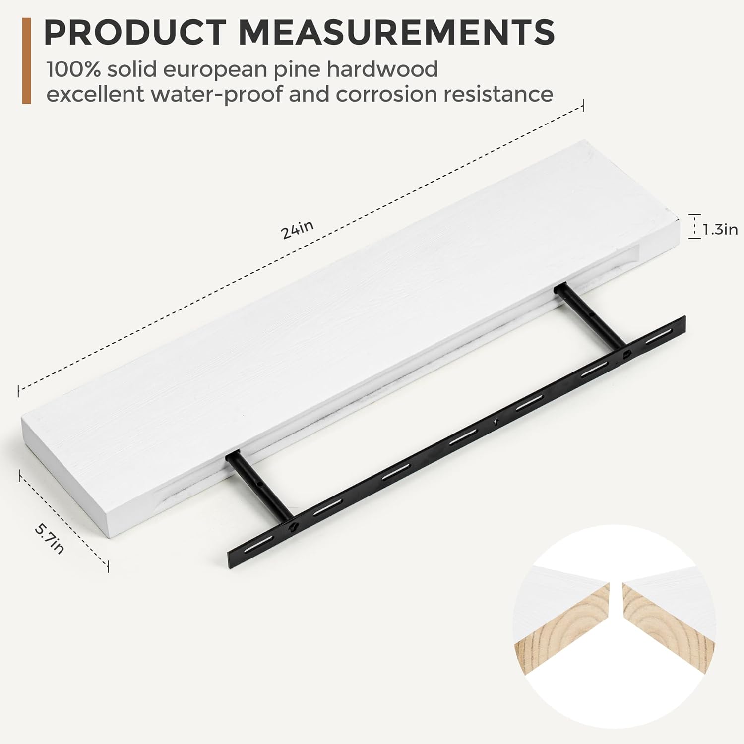 Fun Memories Handcrafted European Pine Floating Shelves - Natural Rustic Wooden Wall Shelf Set of 2-24 Inch Storage Shelf Display Shelf for Kitchen Bathroom Living Room Bedroom Farmhouse - White