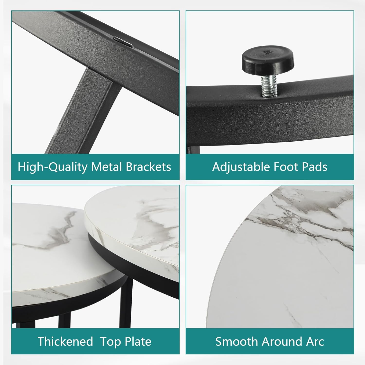 Smuxee White Nesting Coffee Table Set of 2, 23.6" Round Coffee Table Wood Grain Top with Adjustable Non-Slip Feet, Industrial End Table Side Tables for Living Room Bedroom Balcony Yard
