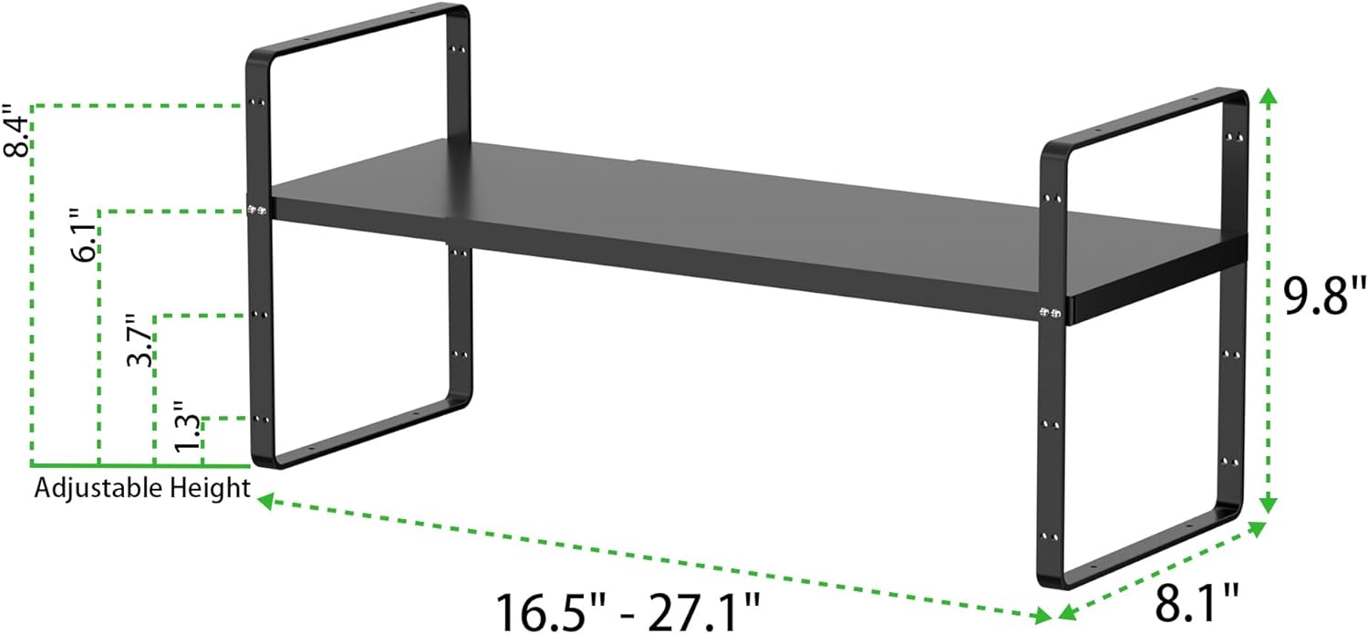 - Adjustable Shelves: This cabinet shelf organizer extends in length and adjusts in height to fit any space you need. The original shelf (collapsed) measures 16.5" L x 8.1" W x 9.8" H. The length can be extended from 16.5 inches to 27.1 inches. This expandable cabinet shelf provides four levels of board height adjustment. You can tailor each shelf with adjusting screws on both sides of the shelf frame
