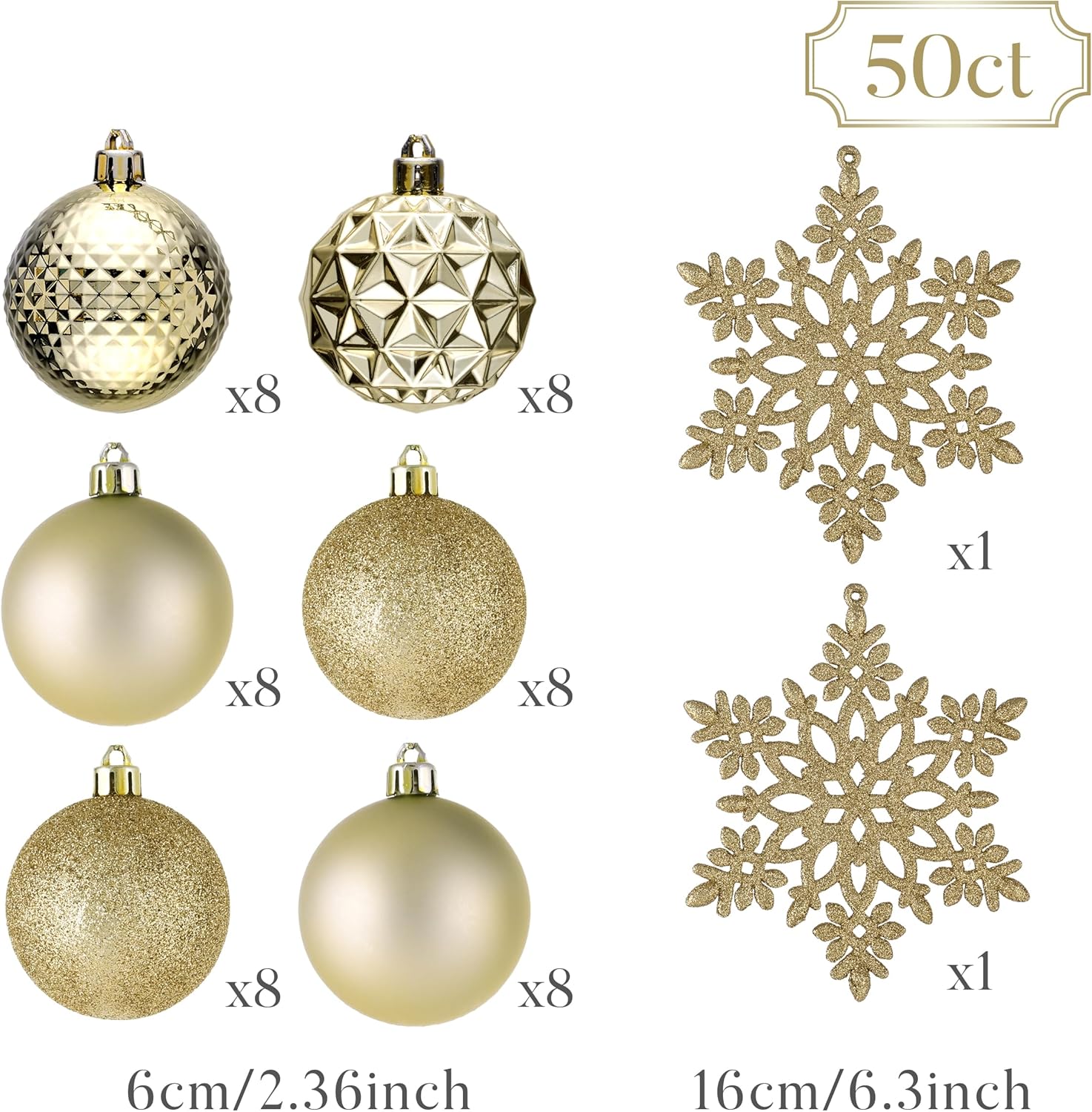 - 【Package and Size】This ornament ball set include 50pcs Christmas ornaments measuring 2.36 inches in diameter, featuring seamless connections for a polished look