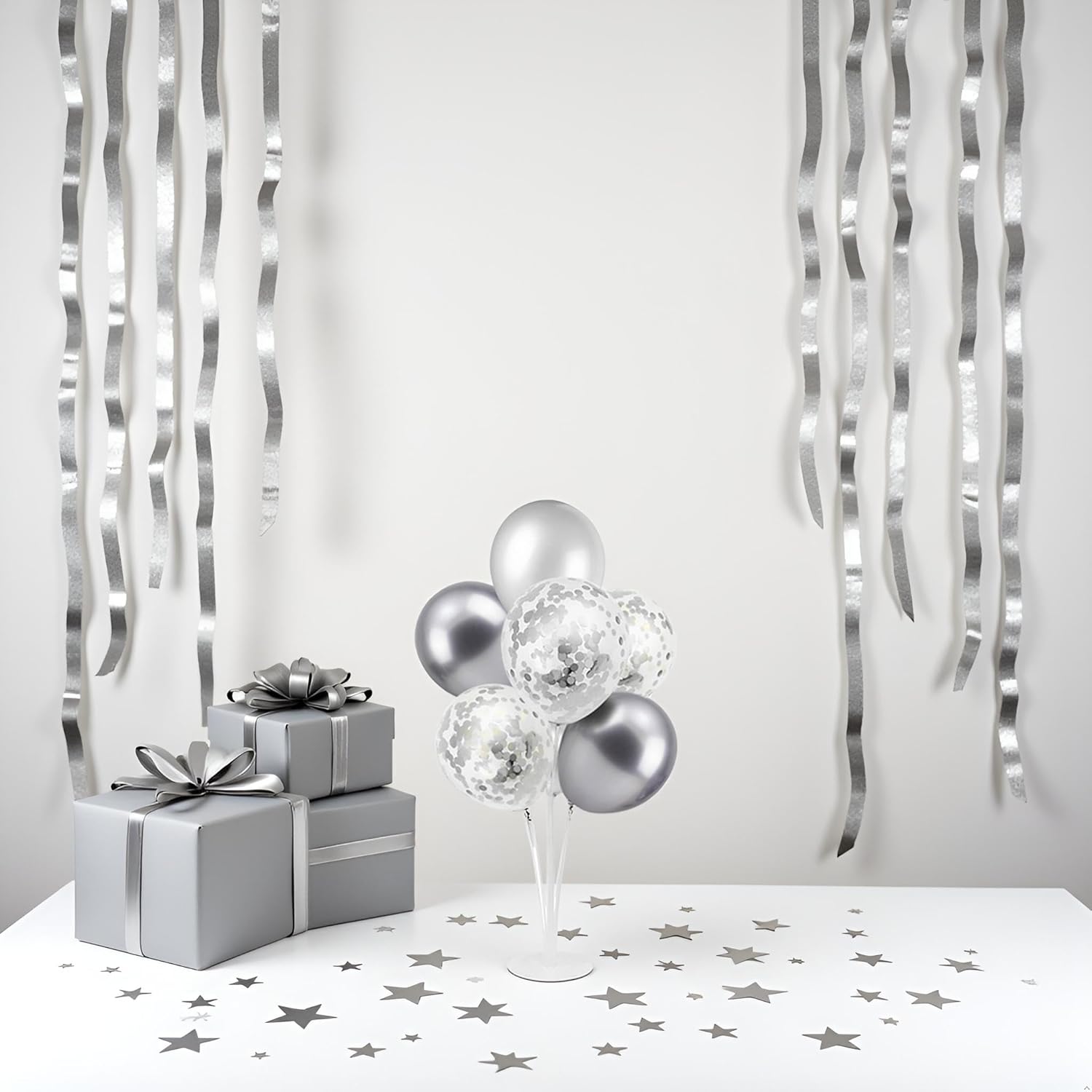 - WHAT INLCUDE: This balloon stand kit include 4 set balloon holders, 35 pcs balloons - silver and confetti balloons, gray balloons, balloon pump, balloon clips, ribbons, glue dots and tie tool