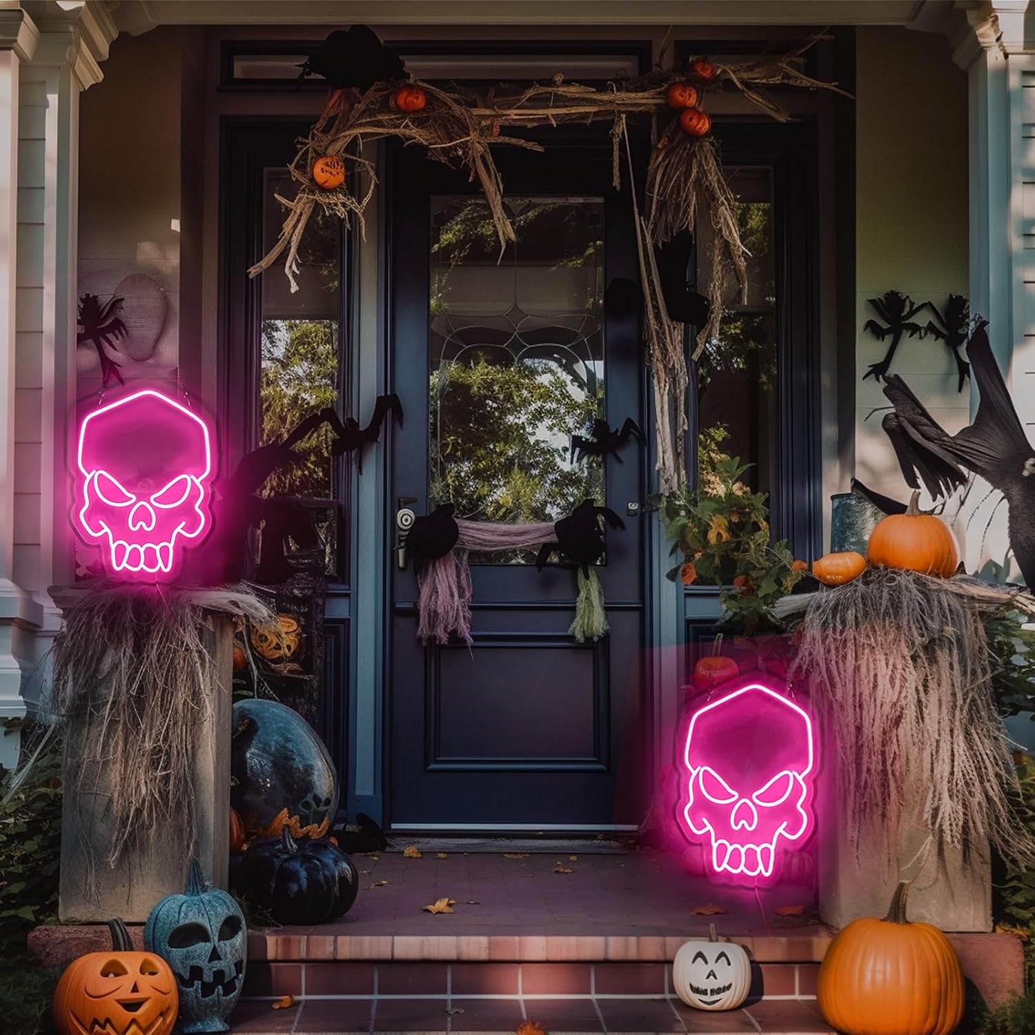 - 【Hallween Skull Neon Sign Decoration】The neon light is in the shape of a skull,pink skull neon sign is made by flexible silicon LED strip lights and fixed on an acrylic clear board