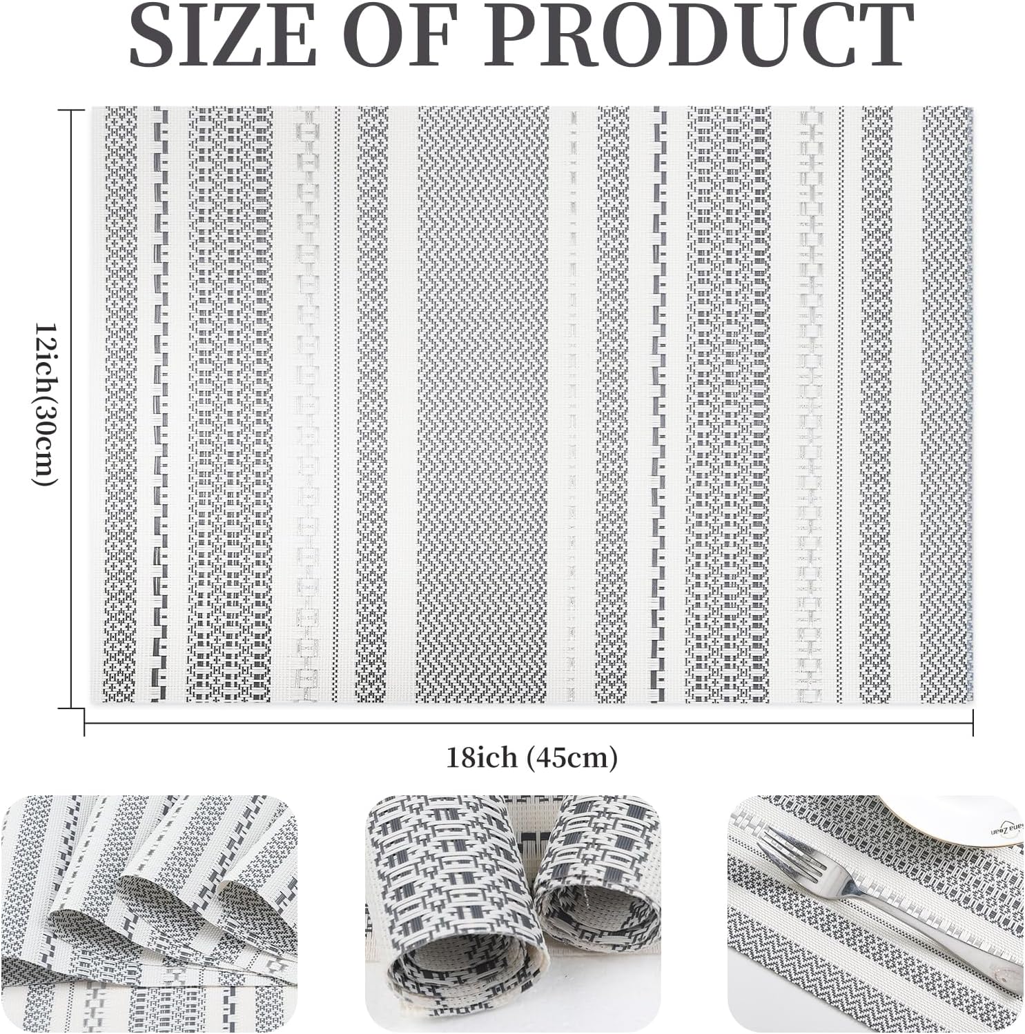 Vinyl Plastic Placemats Set of 6 Washable Heat Resistant Non-Slip Elegant Indoor Outdoor Kitchen Dining PVC Woven Table Place Mats (Dark Grey Striped Silver Wire)