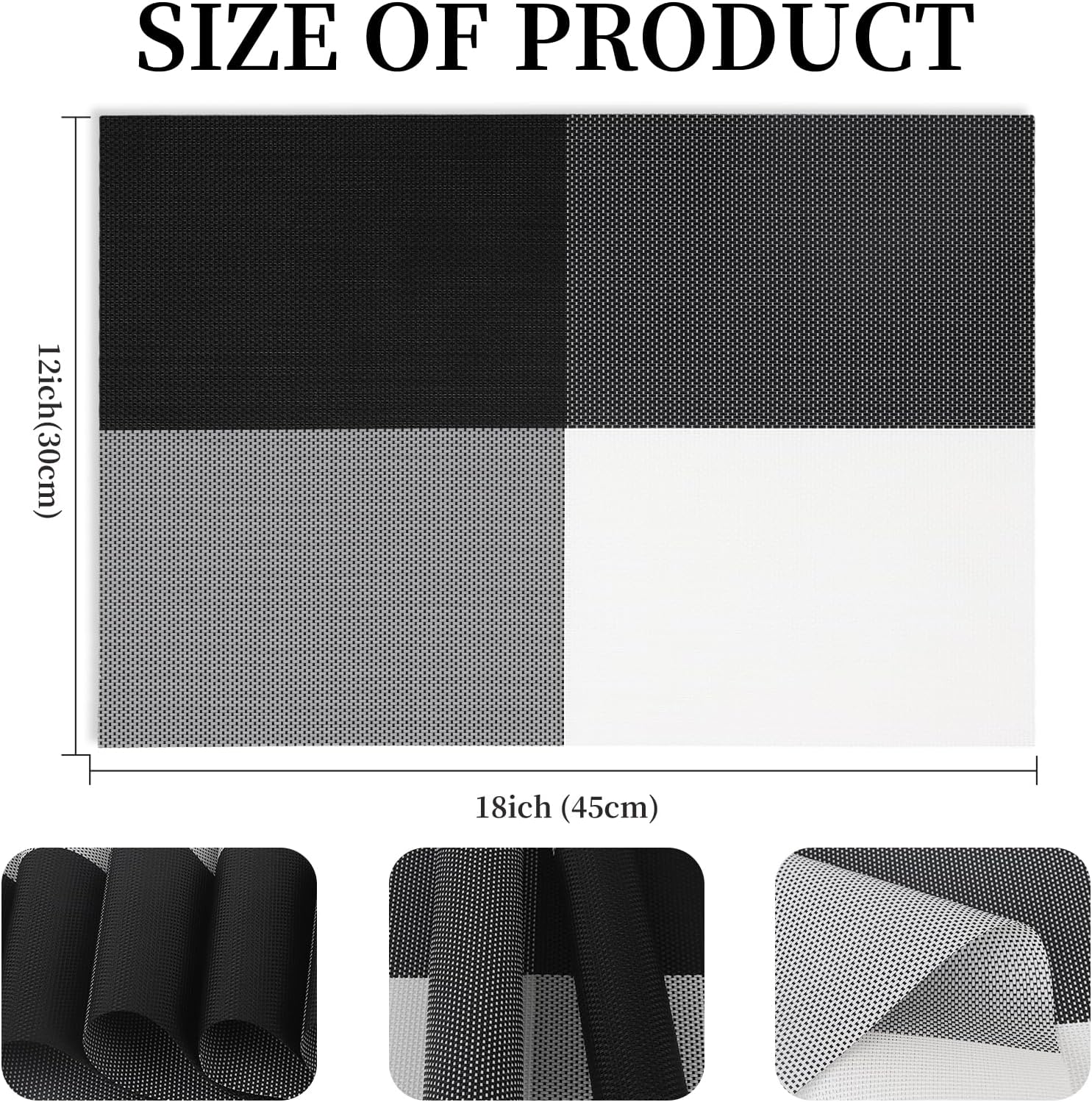 Vinyl Plastic Placemats Set of 6 Washable Heat Resistant Non-Slip Elegant Indoor Outdoor Kitchen Dining PVC Woven Table Place Mats (Black White Lattice Block)