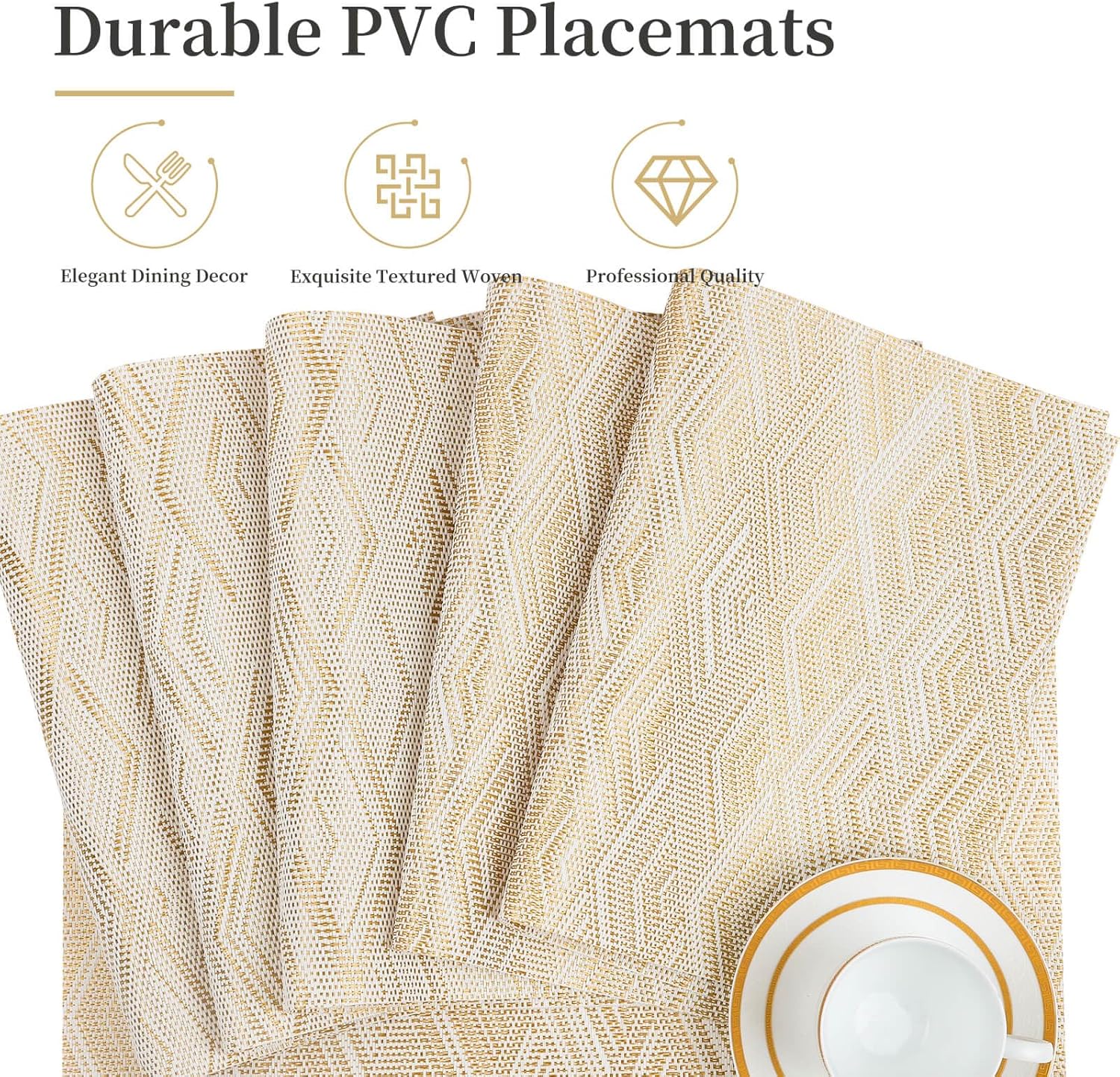 Vinyl Plastic Placemats Set of 6 Washable Heat Resistant Non-Slip Elegant Indoor Outdoor Kitchen Dining PVC Woven Table Place Mats (Gold Yellow Rhombus)