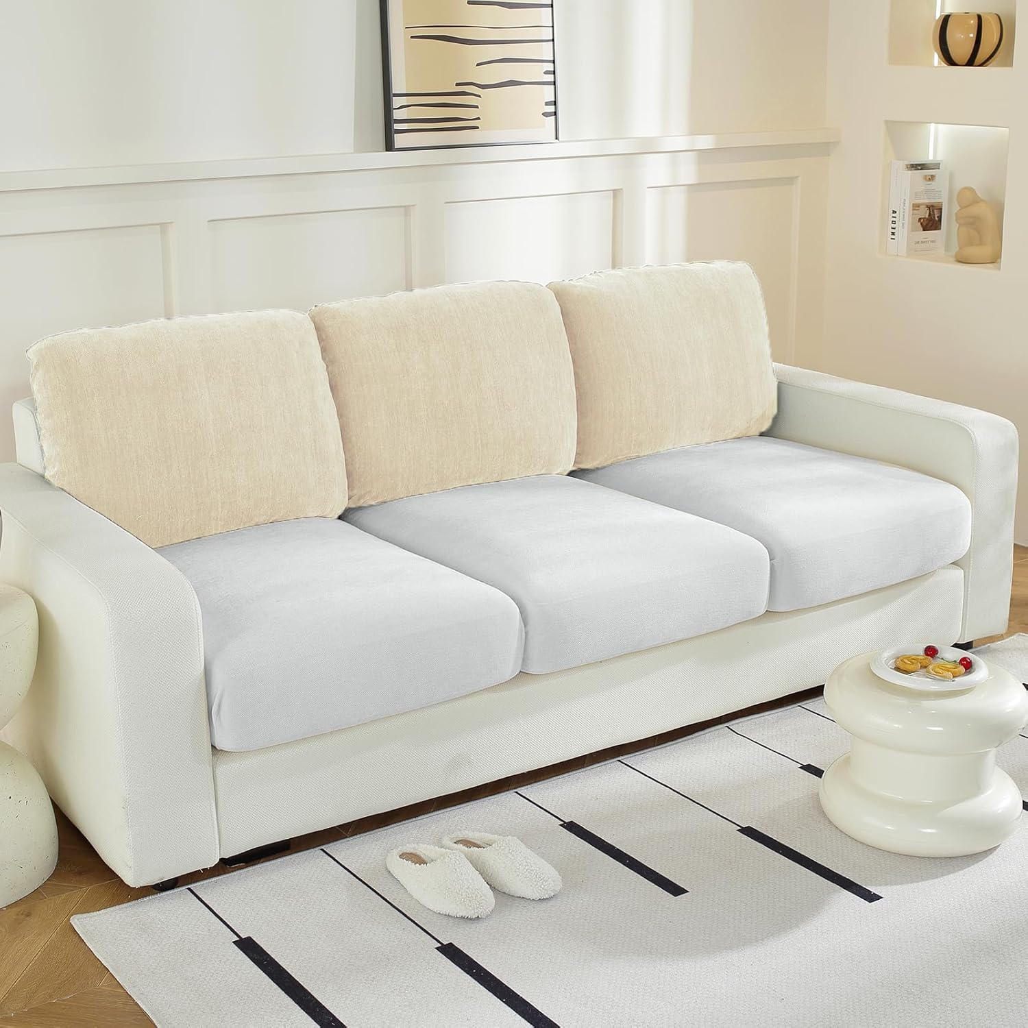 Large Backrest Cushion Covers Super Stretch Backrest Covers for 3 Cushion Couch Sofa, Couch Back Cushion Covers Featuring with Chenille Yarn (Softer Version, 3PC, Beige)