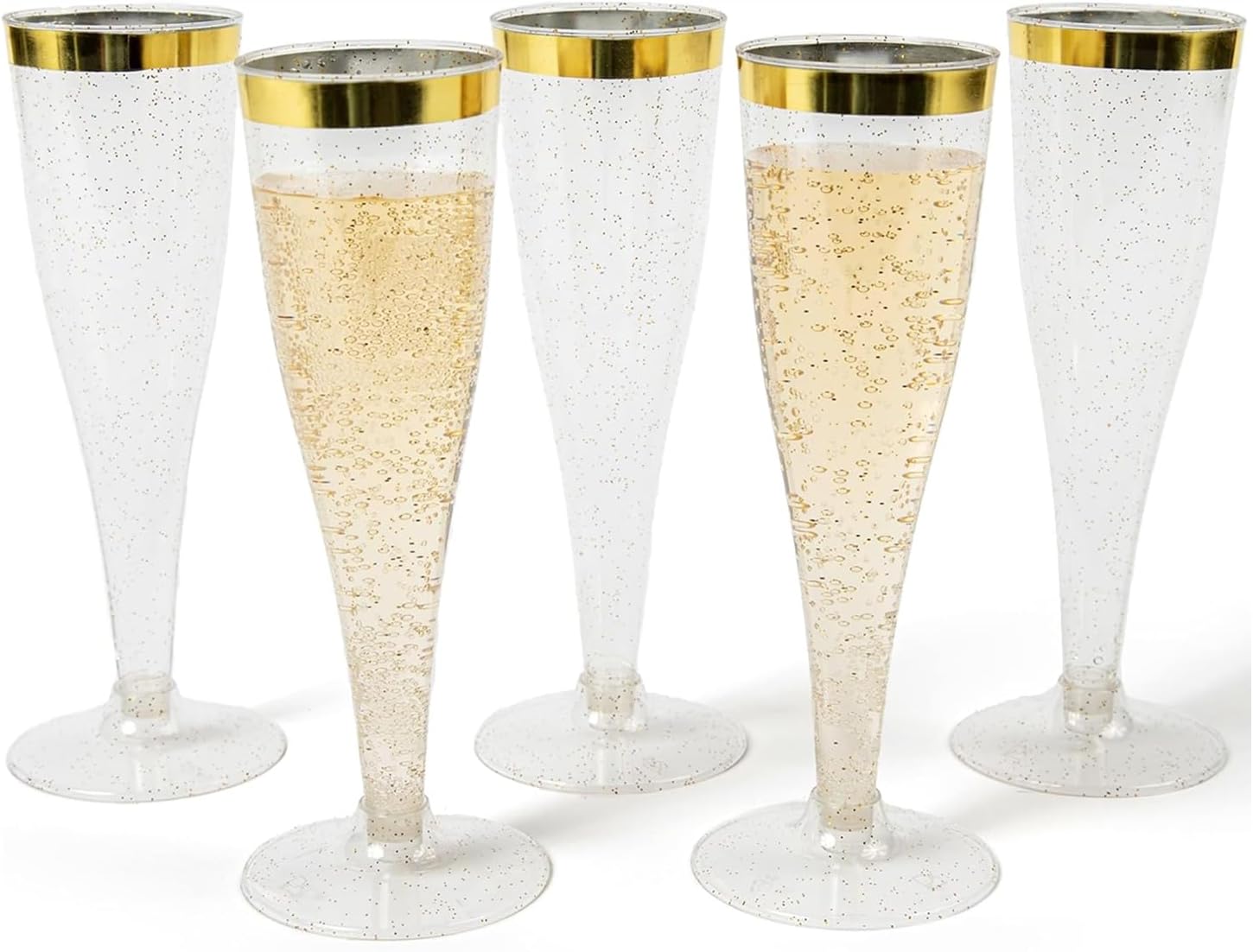 Prestee 48 Disposable Plastic Champagne Flutes with Gold Rim Glitter - Clear Toasting Glasses for Mimosa, New Year’s Eve Party, and Elegant Celebrations - Premium Quality Disposable Stemware