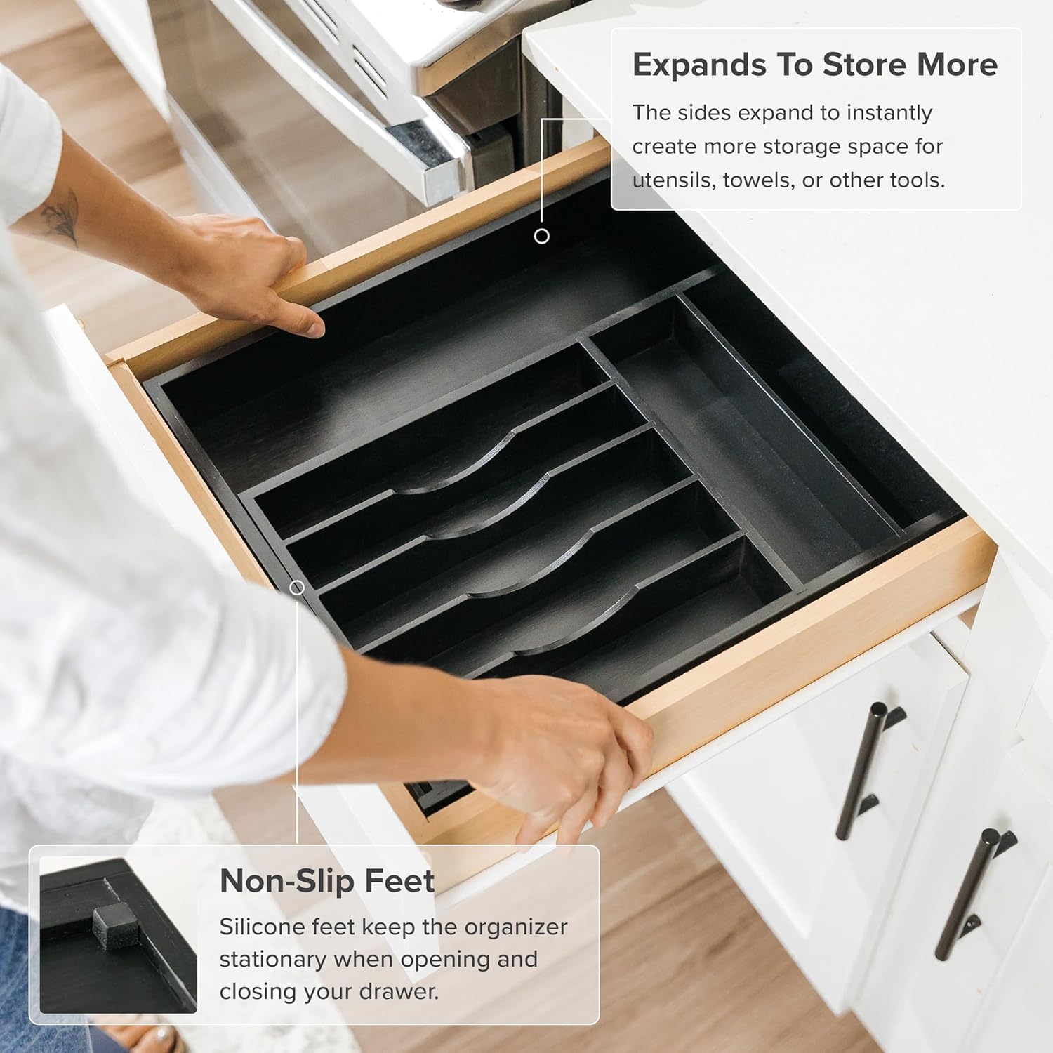 Premium Silverware, Flatware and Utensil Organizer for Kitchen Drawers, Food-Safe Contract Grade, Expandable from 10.5 to 19 In, Black Bamboo