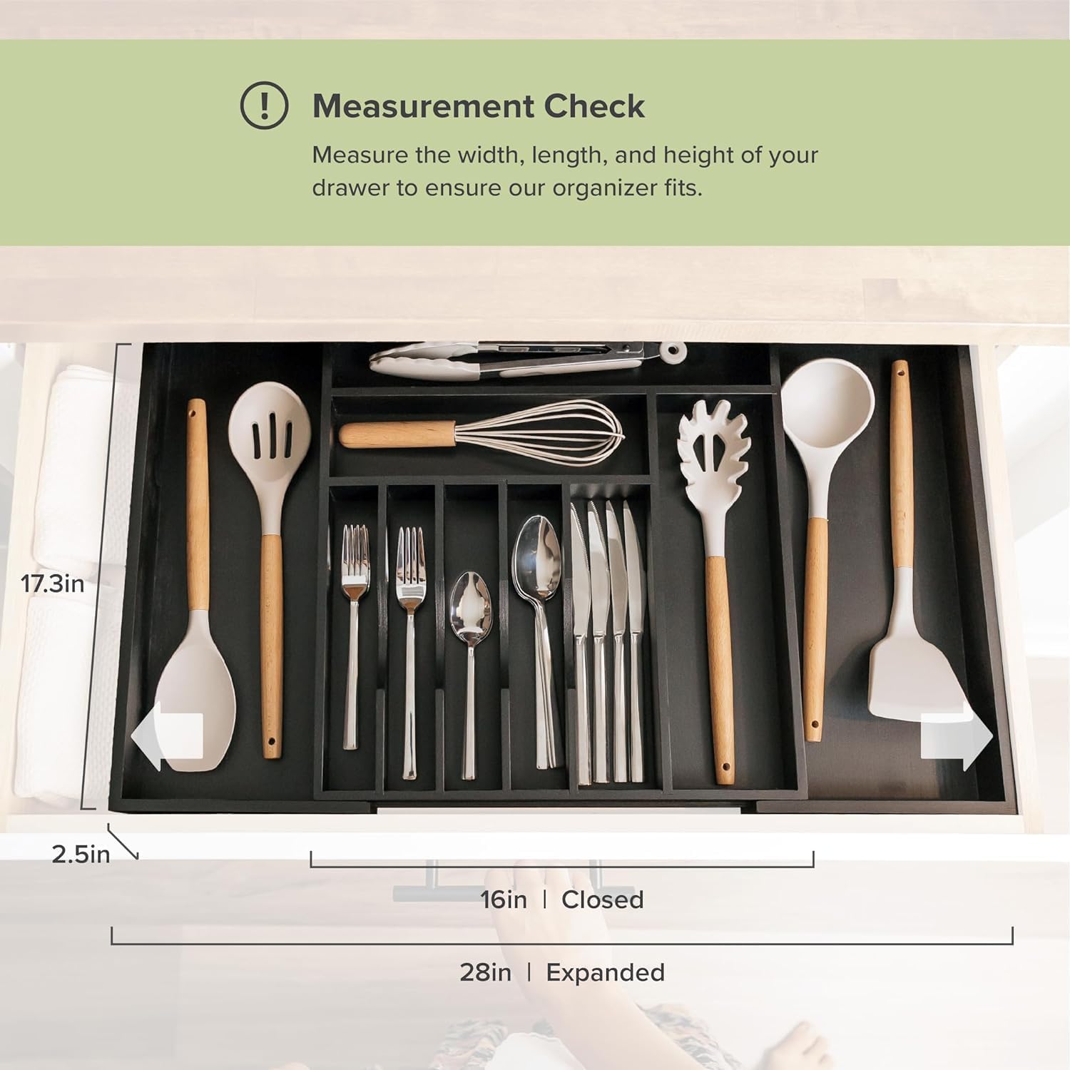 - ADDED HEIGHT, ADDED STORAGE - With an 10-compartment layout (8 fixed + 2 adjustable), this organizer measures 17.4β in length, 2.7β in height, and can stretch between 16β to 28β in width. While many organizers cap at 22β or 23β width and a 2" height, ours provides extra storage courtesy of an additional 0.7" in height, optimizing space when packed with utensils.