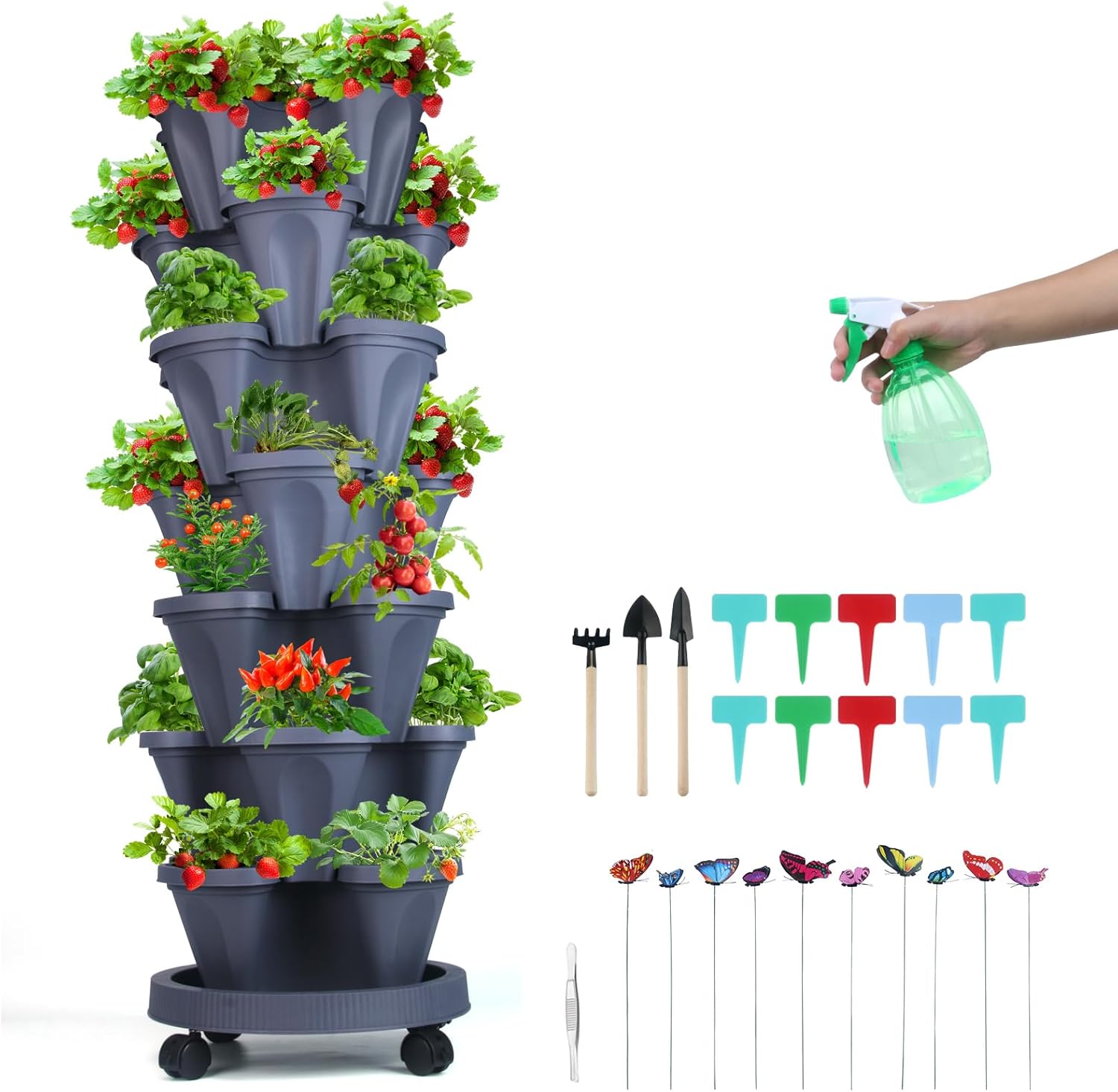 Vertical Planter, 7 Tier Stackable Strawberry Planter with Garden Tool Set, Movable Indoor/Outdoor Garden Herb Pot for Growing Vegetables and Succulents, Dark Gray
