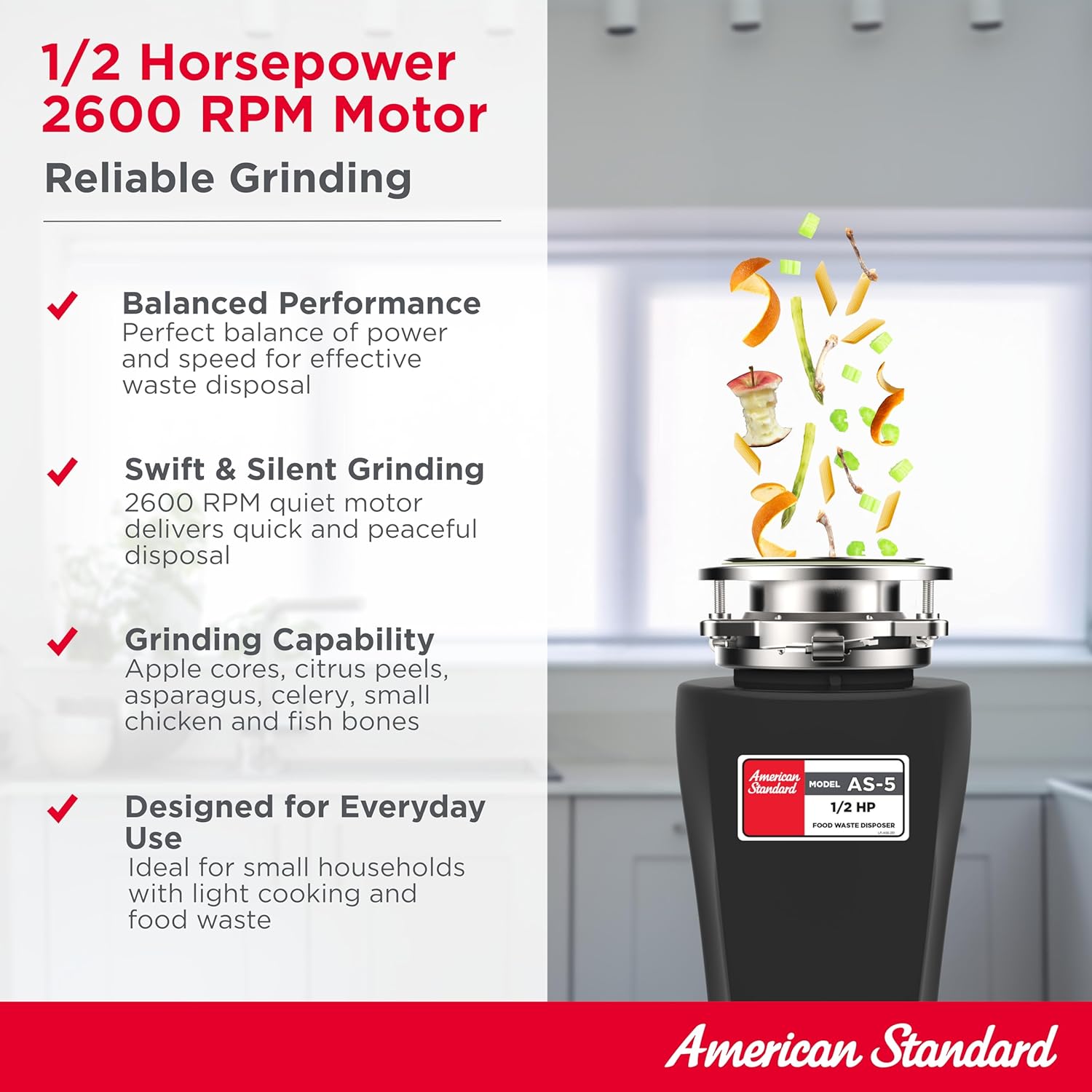 - VERSATILE GRINDING: American Standard garbage disposals handle a wide range of food waste, including soft & tough items, grinding them into fine particles that easily pass through your plumbing system and is safe for septic tanks. This makes it suitable for various kitchen needs