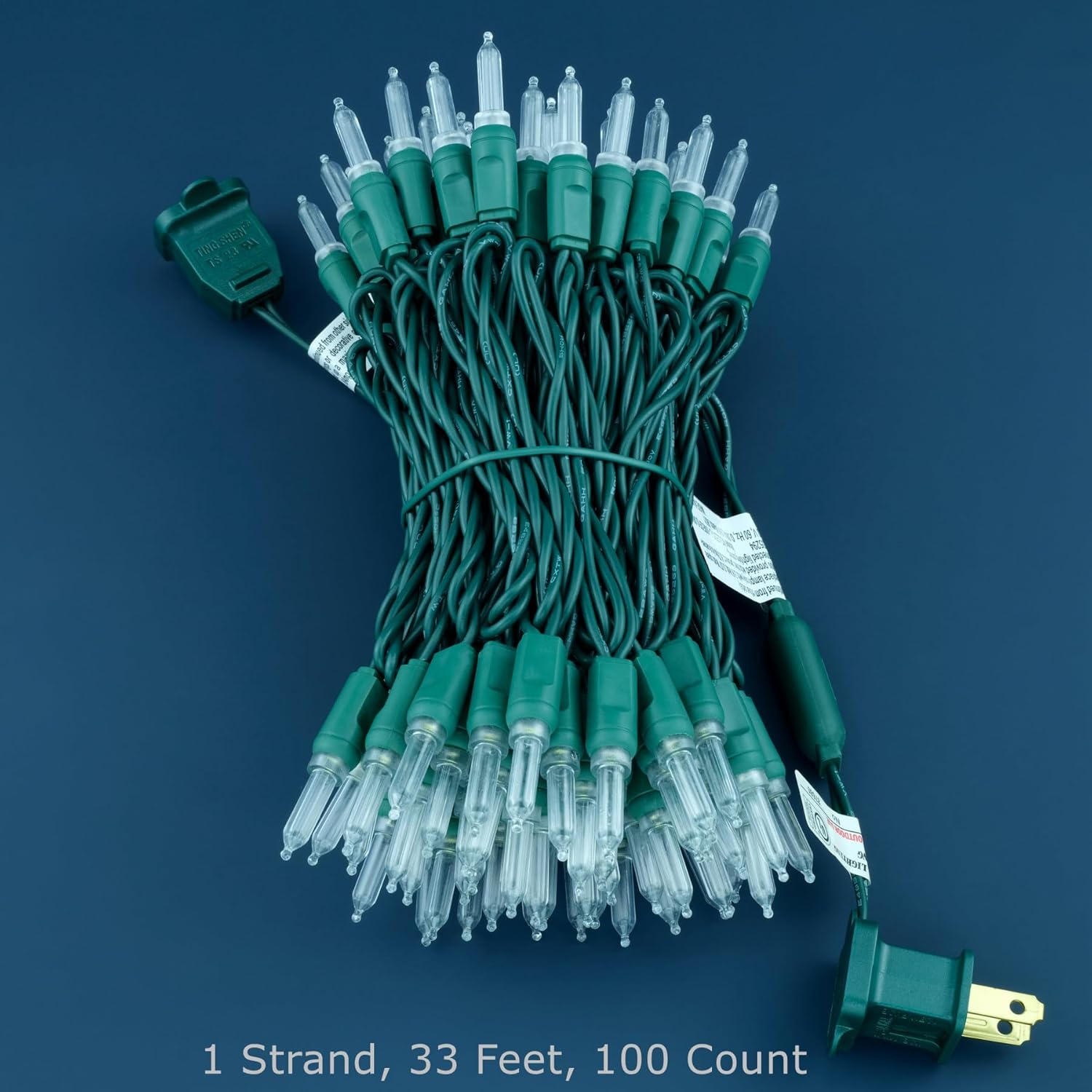 • SPECIFICATIONS β˜€ Each pack contains 1 strands of one-piece string lights, total length 33 feet with 100 count cool white mini lights. 22 AWG green cord, 4" lead, 4" spacing, 4" tail.