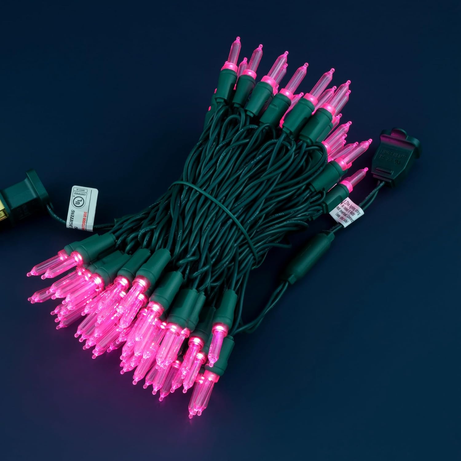 - SPECIFICATIONS β Each pack contains 1 strands of one-piece string lights, total length 33 feet with 100 count pink mini lights. 22 AWG green cord, 4" lead, 4" spacing, 4" tail.