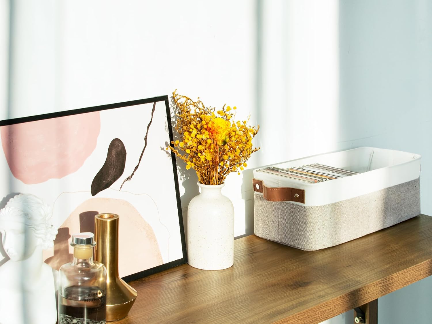 • The sleek modern design with 2 widened sewn-in handles makes this small basket a great addition to any home.