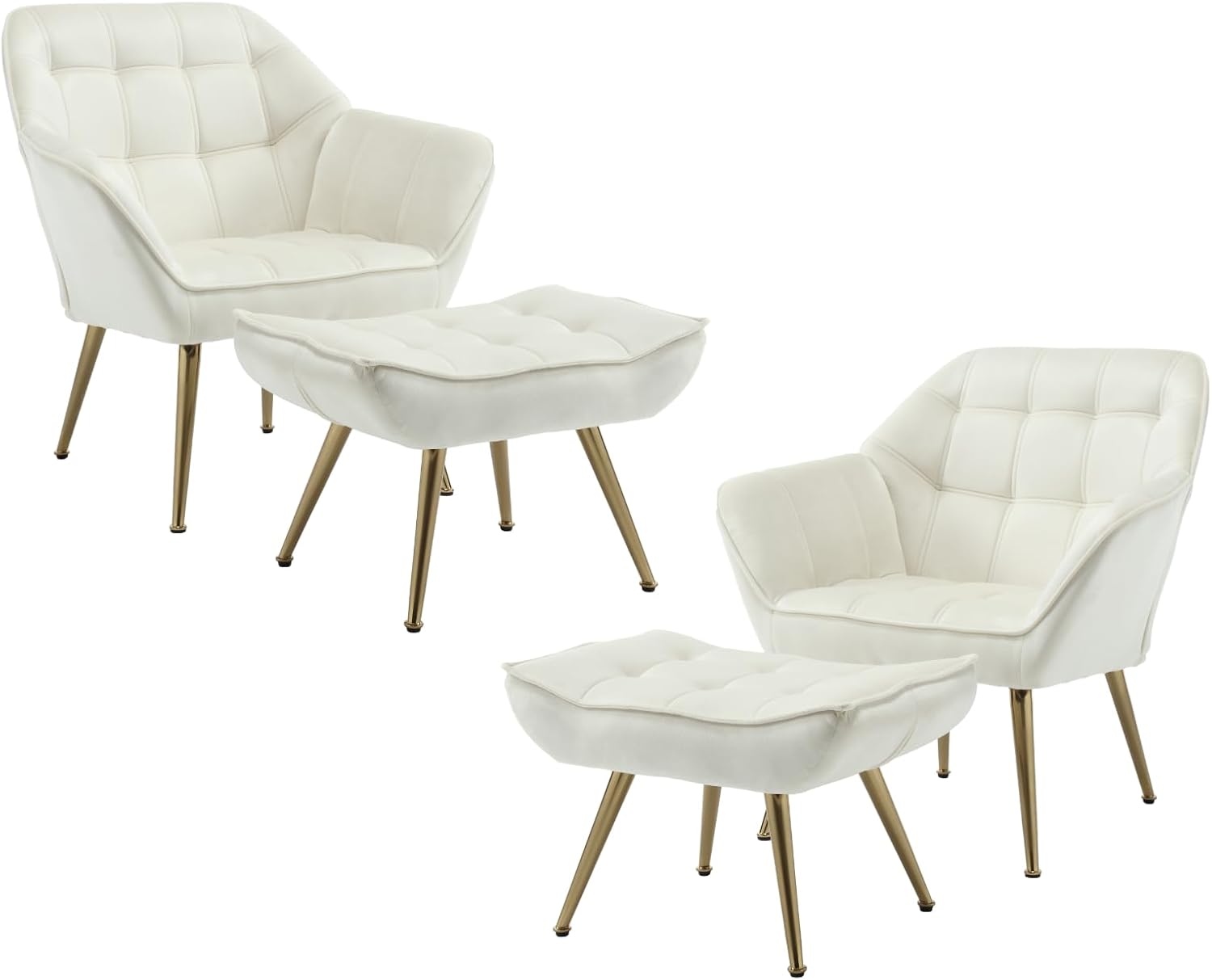 Modern Velvet Accent Chair with Ottoman Set of 2, Upholstered Lounge Chair with Footrest, Comfy Living Room Chair with Gold Legs Accent Side Chair Armchair for Small Space Bedroom, Beige