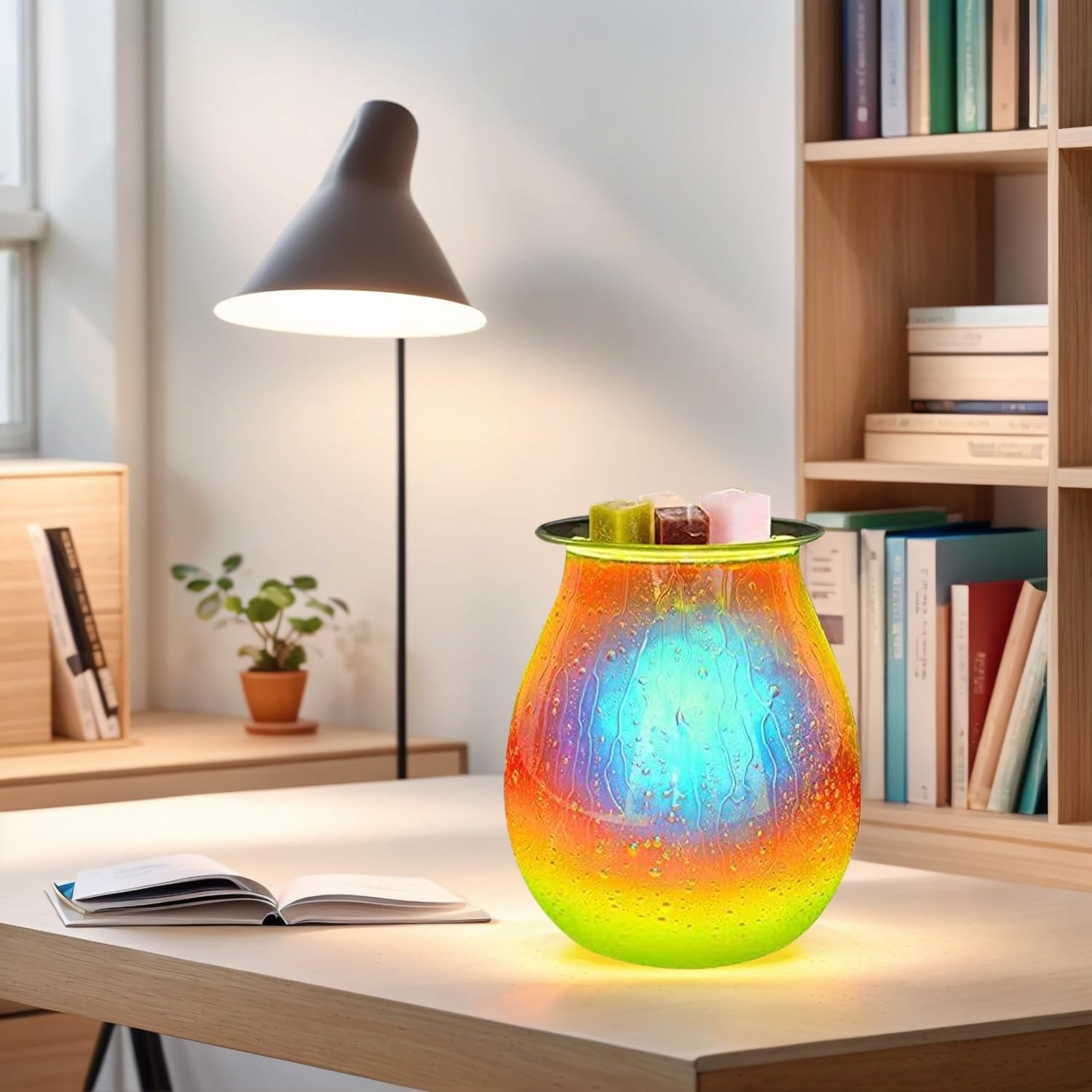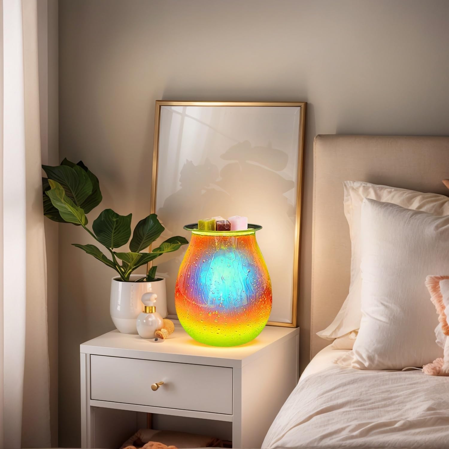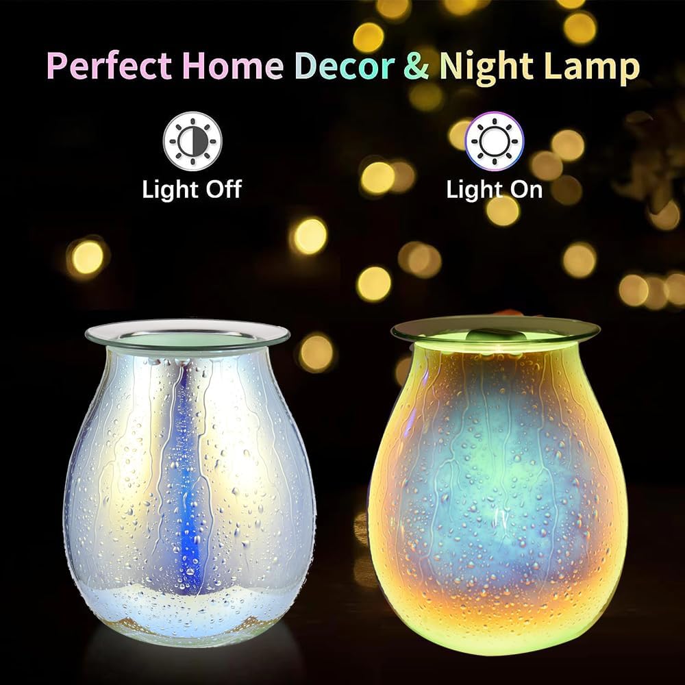 - Warm night light: The built-in light source emits soft and warm light, making the whole wax melting machine exude a warm and romantic atmosphere at night. The light shines through the glass surface, and the three-dimensional water drip marks and the green plated colorful design complement each other, forming a dreamlike visual effect.